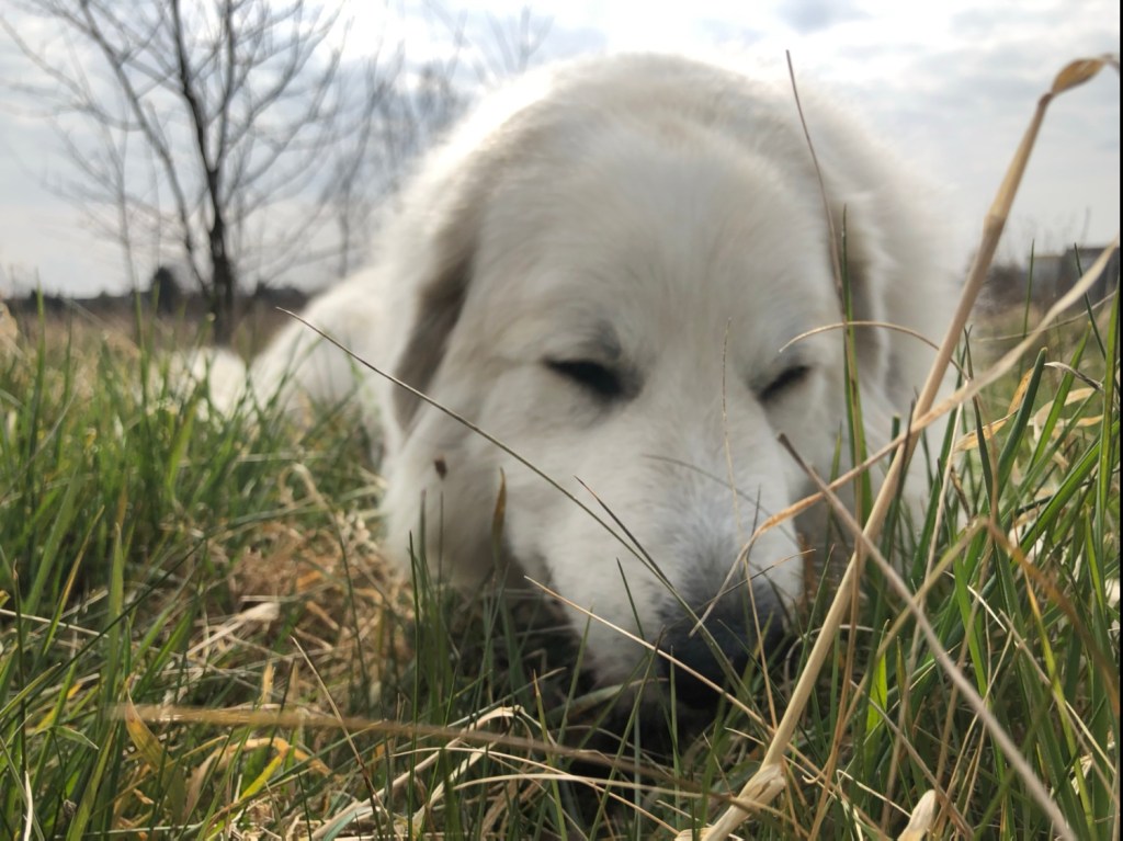 Vom „Waldhaus“ sind wir aber nicht zurück gelaufen, sondern weiter die Straße lang. Dann mußten wir quer durch einen kleinen Wald um wieder auf die großen Wiesen am Waldrand zu kommen. Und da sind wir dann einen ganz großen Bogen über die Wiesen und zur Skihütte gelaufen. Dann ging es weiter zum kleinen Teich und über die Wiese zurück in mein Wohngebiet. Auf der Wiese haben wir aber erstmal eine Pause gemacht und ich habe was gefuttert und einen Ast geknabbert. Aber danach ging es nach Hause und da habe ich erstmal meinen Pyriprinzessinnenschönheitsschlaf gemacht.