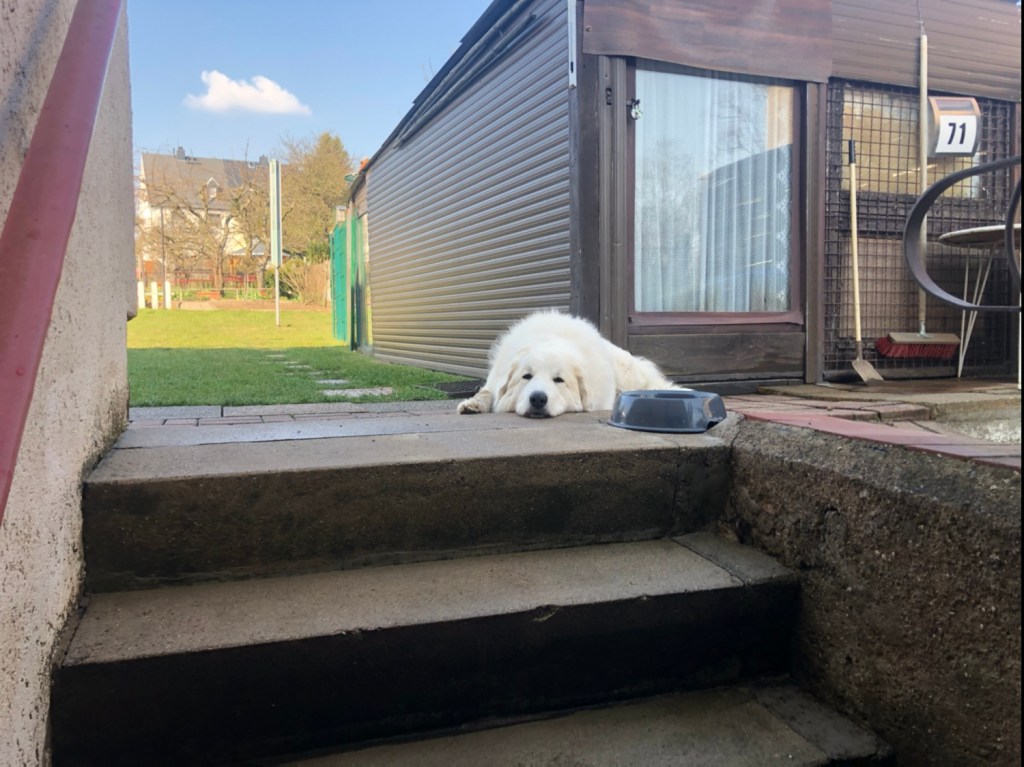 Wir sind dann auch noch eine Runde durch mein Wohngebiet gegangen. Da waren zwei Katzen. Aber die waren ganz ruhig. Und da war ich auch ganz ruhig. Und als wir fast zu Hause waren, sind hinter uns zwei kleine weiße Hunde gewesen und die haben mich angezickt. Da habe ich aber nur kurz geguckt. Und bin einfach ganz entspannt weitergelaufen. Da hat mich mein großer Mensch wieder gelobt.
