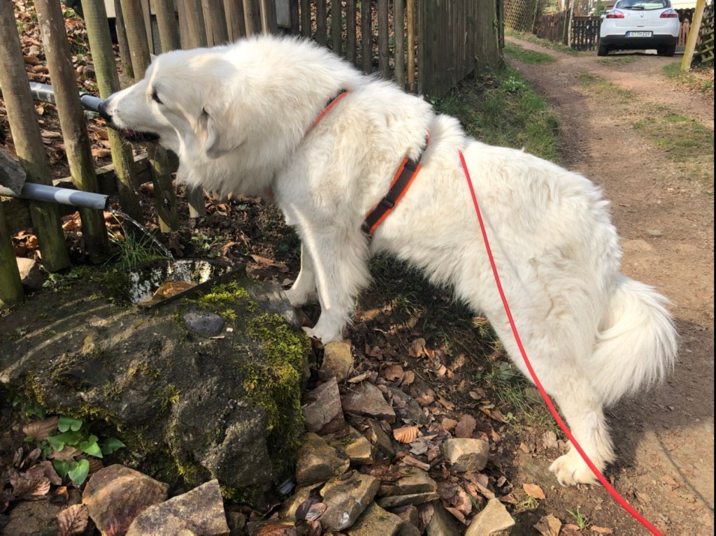Im Wald waren die Rehe. Vier Stück. Die konnten wir ganz lange sehen. Ich habe aber geschnuffelt und bin gar nicht so interessiert gewesen. Vom „Waldhaus“ aus sind wir wieder ein Stück die Straße entlang und dann aber gleich auf einen Weg abgebogen, der uns auf die großen Wiesen hinter dem Wald geführt hat. Und an dem Weg kam au einem Garten Wasser aus der Erde rausgelaufen. Da habe ich erstmal getrunken.