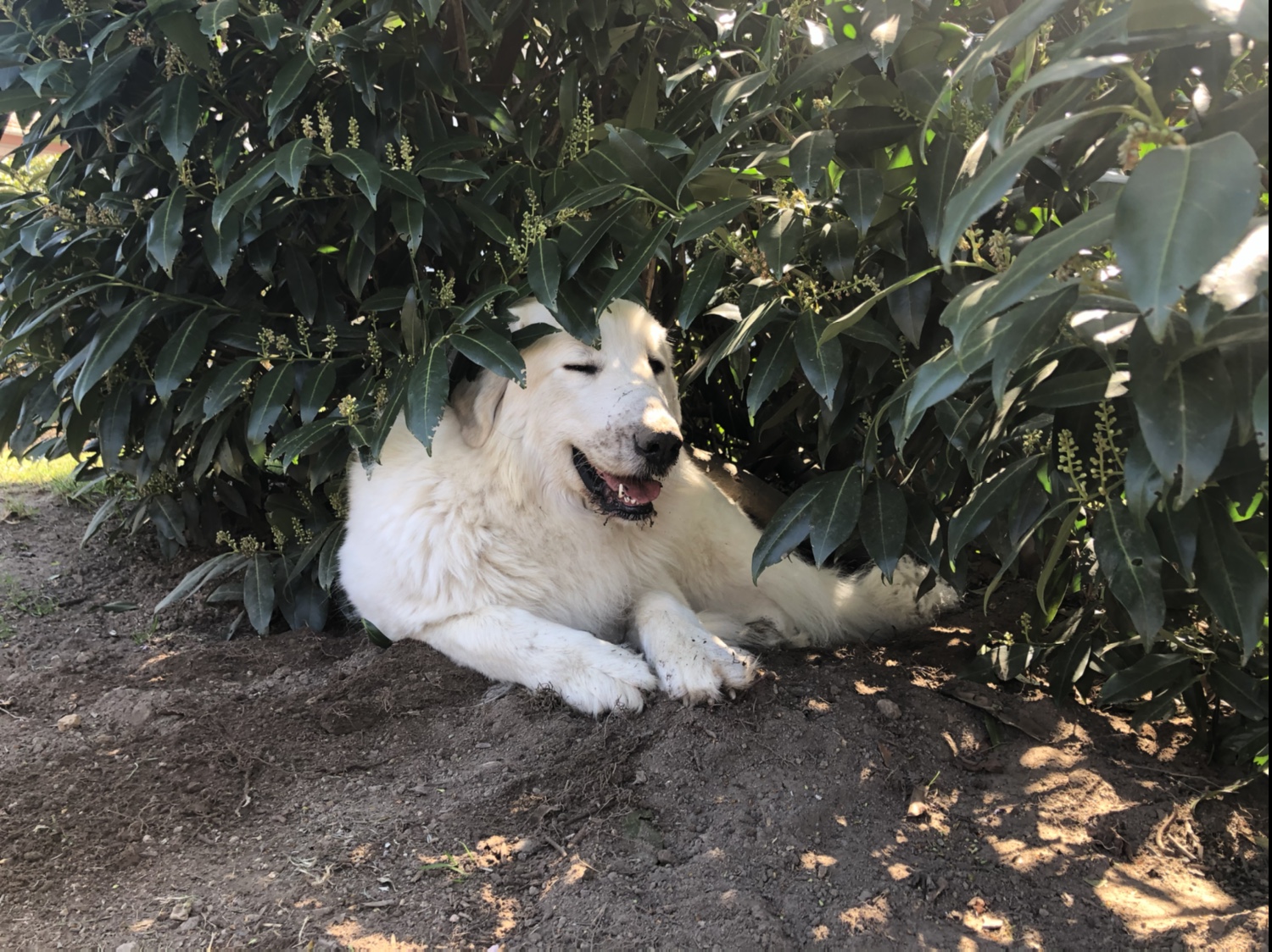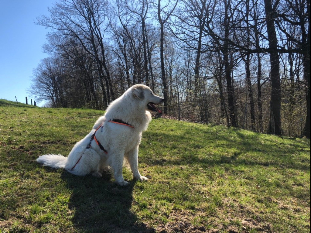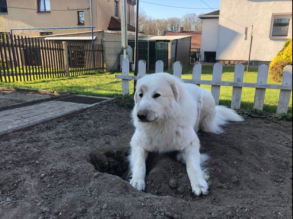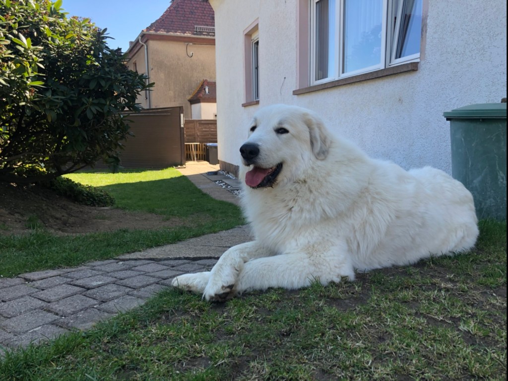 Da habe ich zunächst mal wieder alles kontrolliert. Das gehört zu meinen Aufgaben. Ordnung muß sein! Und dann habe ich mein wunderschönes Pyrinäschen in der Erde gewühlt. Bei meinem Buddelloch. Danach sah ich sehr hübsch aus. Und ich habe meinen Garten bewacht. Bis mein großer Mensch zum Spaziegang gekommen ist. Meine liebe Sonne ist auch da gewesen.