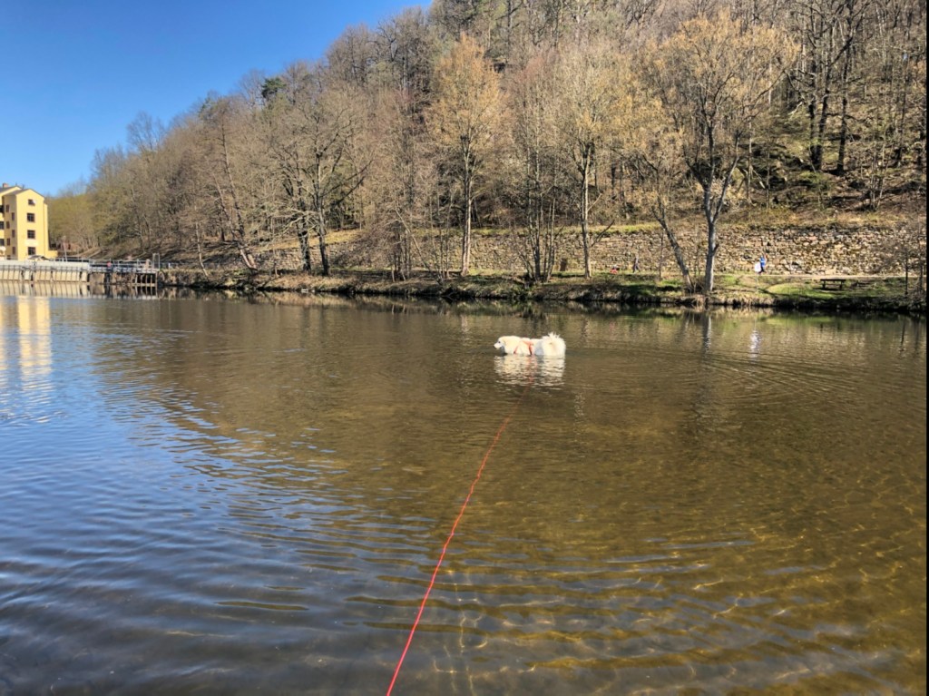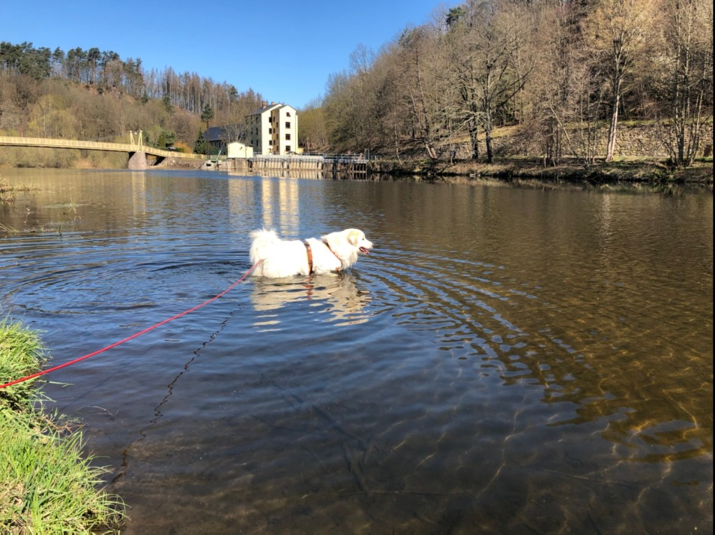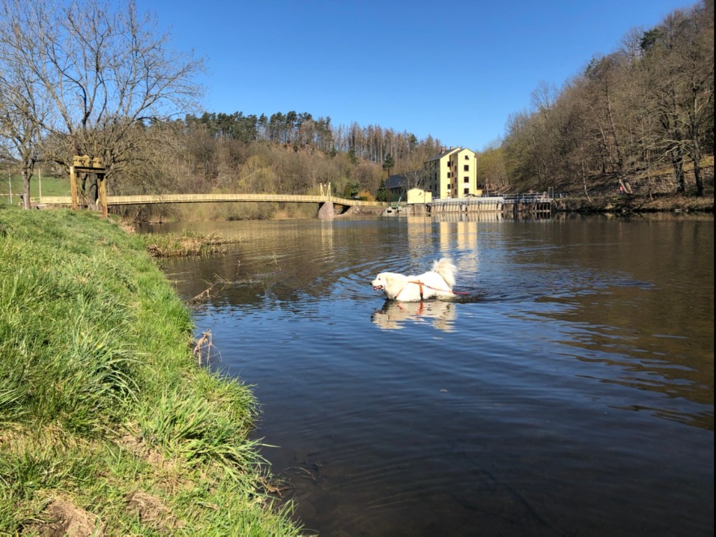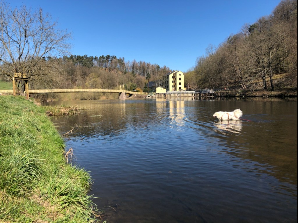 Wir sind dann zum großen Feldweg und an meiner großen Feldwiese vorbei zum kleinen Feldweg gewandert. Da ging es dann den ganzen Weg lang bis er zu Ende war und weiter über die Wiesen am Feldrand lang bis zum großen Fluß mit dem komischen Namen. Und da bin ich dann baden gewesen. Das Wasser ist jetzt wieder ganz sauber und ich kann ganz weit in die Tschooo-Pauuu rein.