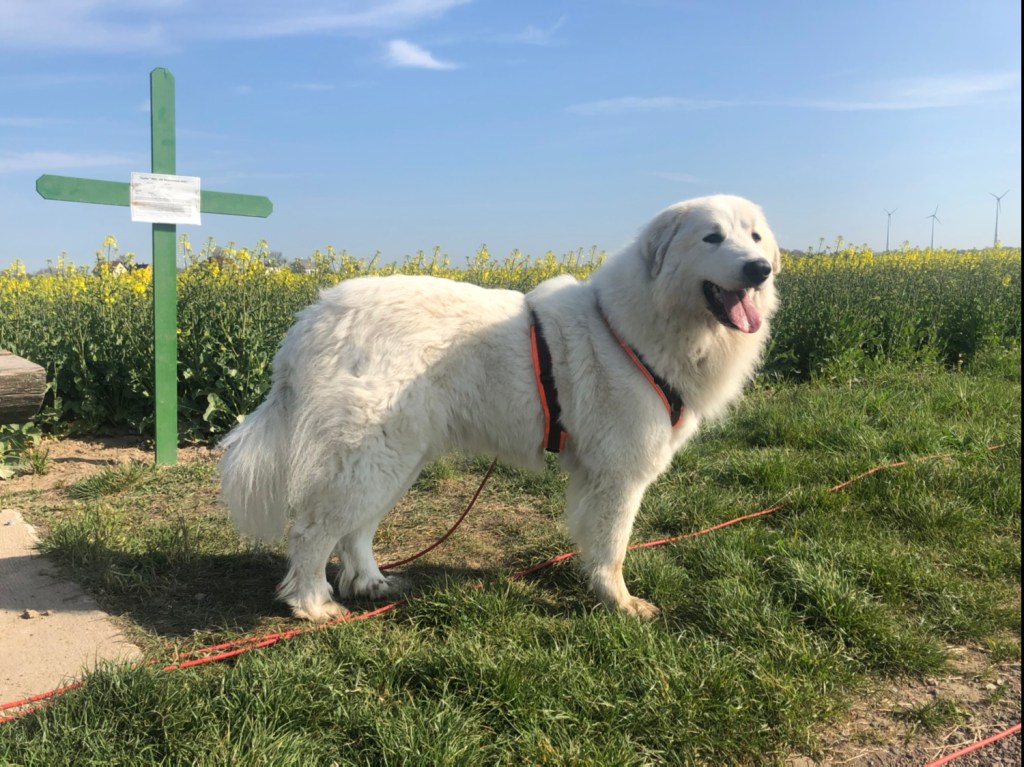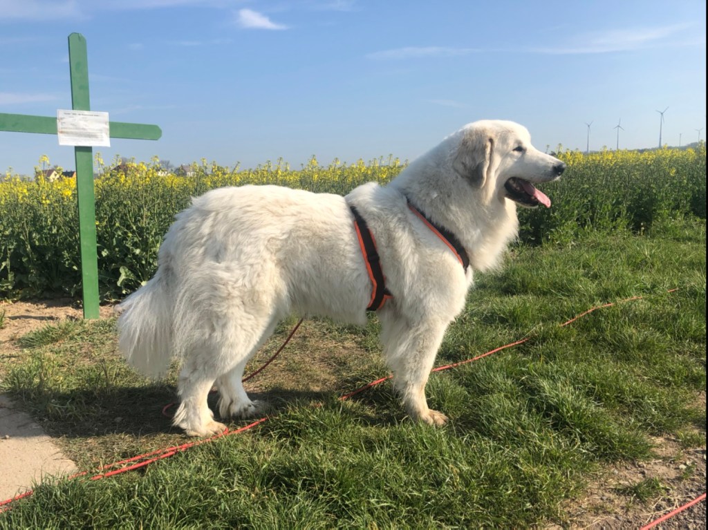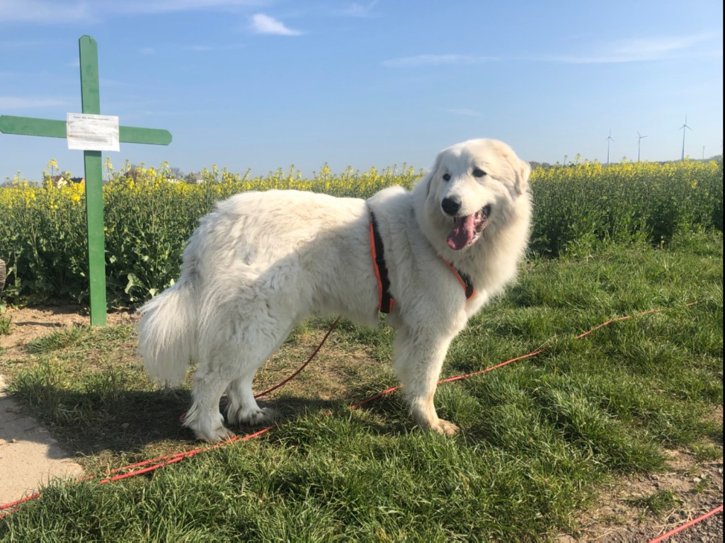 Jaaaaa, und dann haben wir unseren Spaziergang gemacht. Immunsystemkonditionierungstrainingseinheit. So heißt das jetzt. Ich bin mit meinem großen Mensch nach Kockisch gewandert. Vorbei an meiner großen Feldwiese und den ganzen großen Feldweg lang. Zwischendurch war ich auch mal im Feld. Rapsfeld heißt das, weiiil, da wächst der Raps. Der ist grün. Und blüht gelb. Sieht gar nicht schlecht aus.