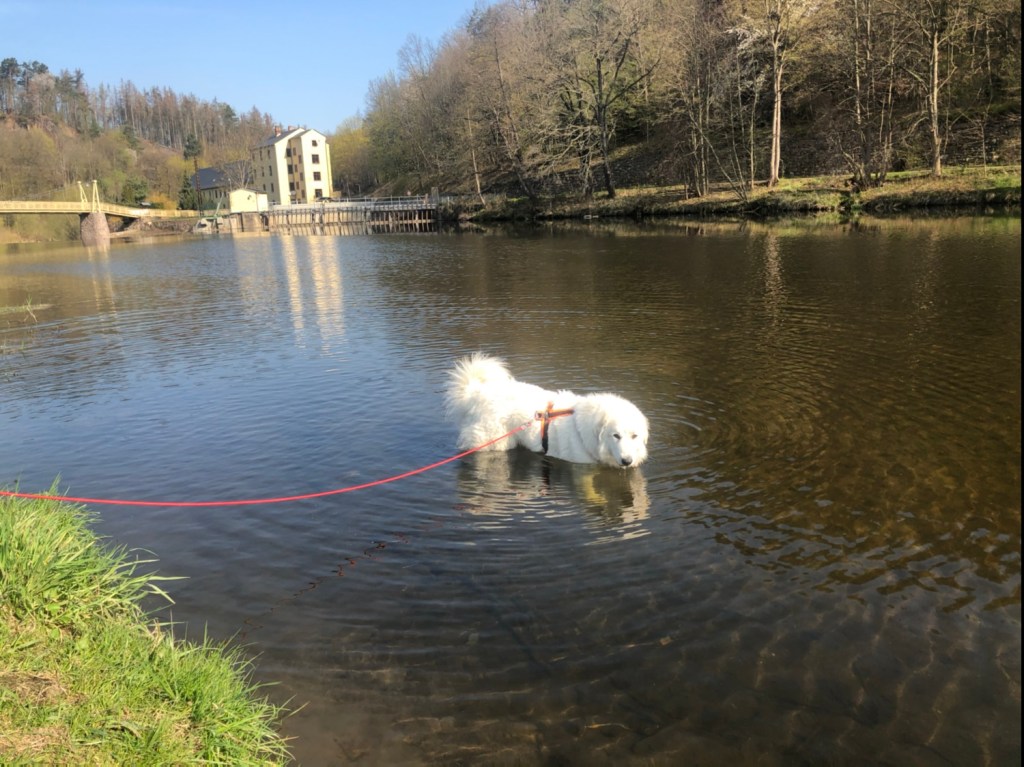 Dann sind wir durch Kockisch gelaufen. Auch beim Kalle vorbei. Der war in seinem Garten und hat sich über die Bella gefreut. Wir sind dann an den großen Fluß mit dem komischen Namen gegangen. Aber nicht zur Wackelbrücke, sondern in die andere Richtung. Zu der kleinen Treppe. Da kann ich auch schön baden gehen. Ich war aber nur kurz drin. Habe mich abgekühlt und schön was getrunken.