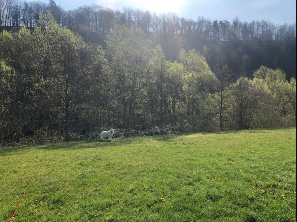 Danach sind wir immer weiter an der Tschooo-Pauuu lang und dann schräg über die Wiese drüber, den Hang hoch zum Waldrand und da sind wir über die Wiese zwischen Wald und Feld geschlendert. Ich habe am Waldrand immer geguckt, ob ich die Rehe sehe. Und dann habe ich sie gesehen, die Rehe. Im Wald. Und da wollte ich hinlaufen, aber mein großer Mensch hat mich zurückgerufen. Und da bin ich stehen geblieben, weiiil, mein großer Mensch hing ja am anderen Ende von meiner schönen langen roten Feldleine. Und wenn ich da weiterrenne, dann hau ich den um, da fliegt der durch die Luft. Das habe ich schon gemacht. Ich bin doch so gewaltig und stark. Aber ich will meinen großen Mensch nicht umhauen. Nur wenn wir spielen und Spaß machen, da schon.