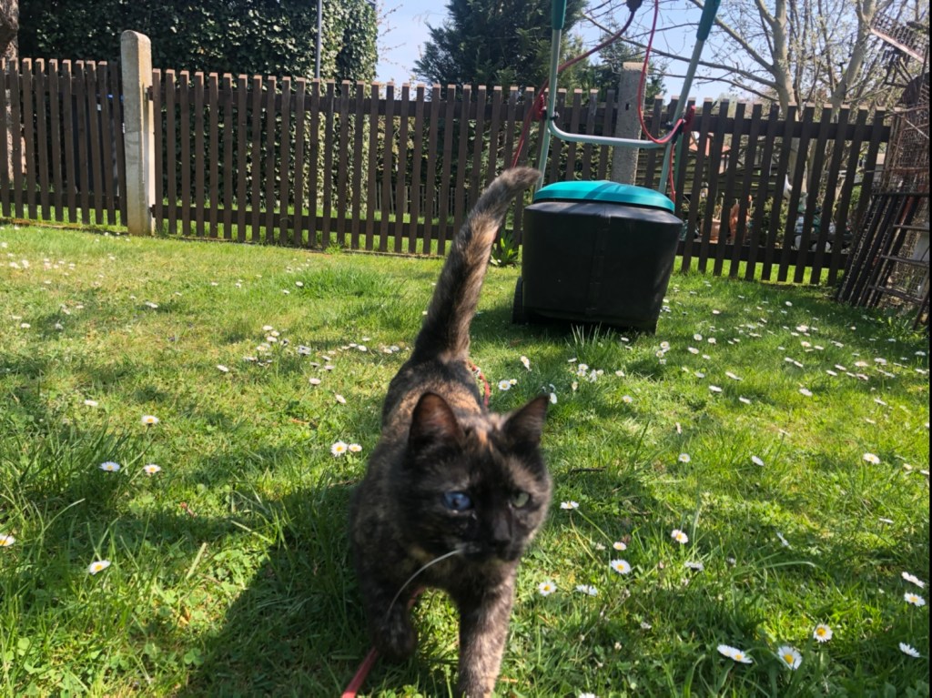 Nachmittags sind wir alle zusammen in meinem Garten gewesen. Meine Menschen haben Gartenarbeit gemacht. Die Wiese wieder schön und so Zeugs. Und die kleine Freche Nachbarkatze war auch da. In meinem Garten! Die hat mit meinem großen Mensch geschmust. Das habe ich gesehen. Die ist ganz schön frech. Ich war aber ganz ruhig, habe nur geguckt. Aber später ist sie wieder da gewesen. Und da habe ich aber mal gezeigt, daß das mein Garten ist. Hohohooo, da ist sie mit einem Satz über den Gartenzaun geflüchtet. Die kann vielleicht hoch hüpfen, so klein wie die ist. Kleine freche Katze.