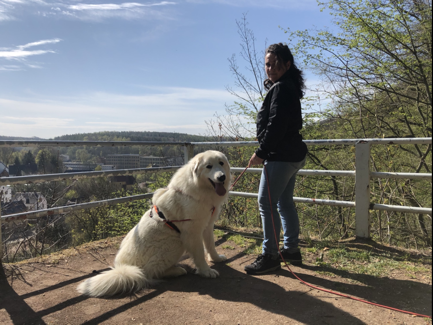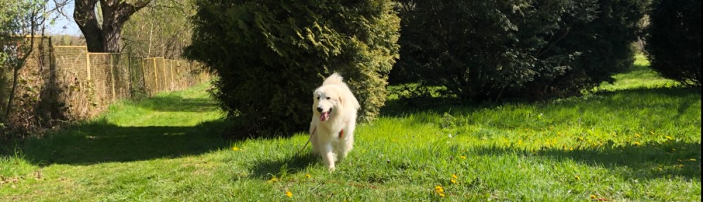 Wir sind dann spazieren gegangen. Und zwar die Bella – das bin ich, die wunderschöne, champagnercremeweißfarbene Pyrenäenbergprinzessin – mein großer Mensch und meine große Menschin. Wir sind die Straße lang zum Stadtpark. Da durfte ich wieder an meine lange rote Feldleine. Nur zwischendurch war ich mal an meiner roten Feldleine. Da ist uns ein Hund entgegengekommen, ein kleiner. Und der hat mich schon von weitem angeknurrt und dann auch noch gebellt. Das macht man nicht, weiiil, da wird die Bella ganz böse. Aber gaaaaanz böse! Ich laß mich doch nicht anknurren. Ich bin eine Herdenschutzhündin. Man knurrt mich nicht an.