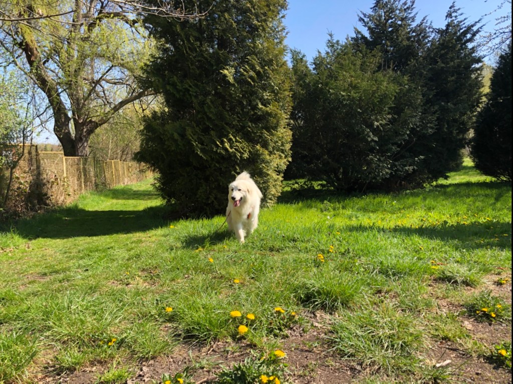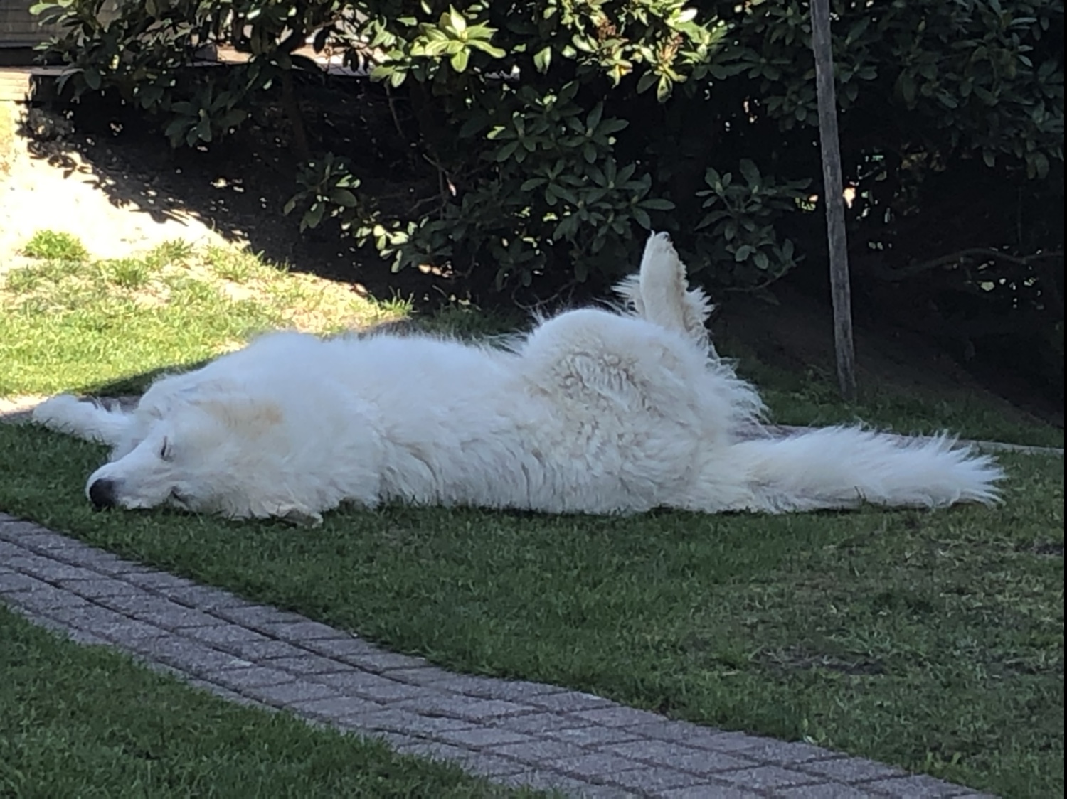 Dann haben wir noch einen schönen Abendspaziergang gemacht. Zuerst wieder durch die Siedlung und danach noch durch mein Wohngebiet. Das ist meine Lieblingsabendrunde. Da kann ich alles nochmal kontrollieren. Ich bin ja eine Herdenschutzhündin. Zu Hause habe ich mich gleich in meinen Garten gelegt und mein großer Mensch ist erstmal abendfuttern gegangen. Und dann hat er mich in meine Kellerwohnung geholt. Aber ich habe ganz schlau gleich so getan, als würde ich schon schlummern. Das kann ich gut. Aber der fällt da nicht so richtig drauf rein.