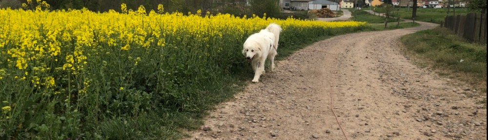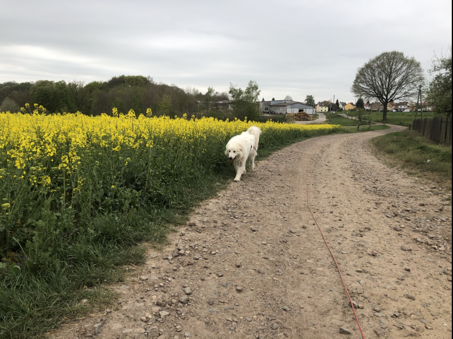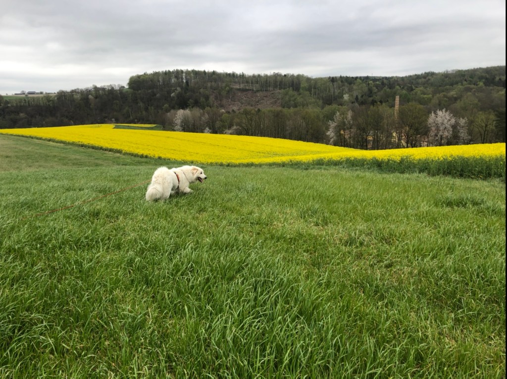 Zuerst sind wir zu meiner großen Feldwiese. Und immer den Feldweg lang. Da ist jetzt links und rechts alles gelb. Raps heißt das. Und das blüht ganz schön. Am Ende vom großen Feldweg sind wir dann abgebogen. Auf die Wiese. Von da kommen wir sonst immer gelaufen, wenn wir den kleinen Feldweg lang gehen. Wir sind über die Wiese gegangen und da waren dann die Ziegen in einem Garten. Die habe ich mir angeguckt.