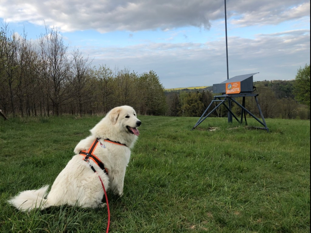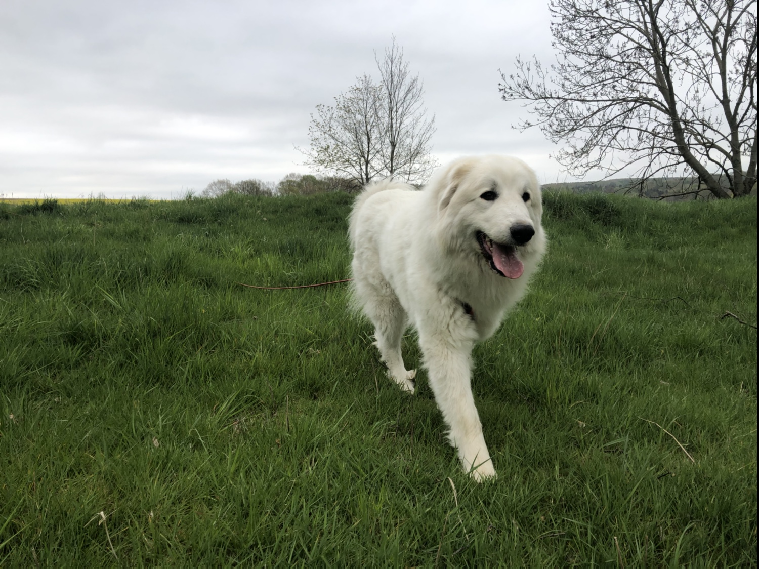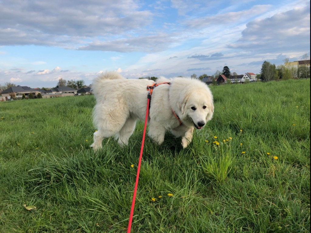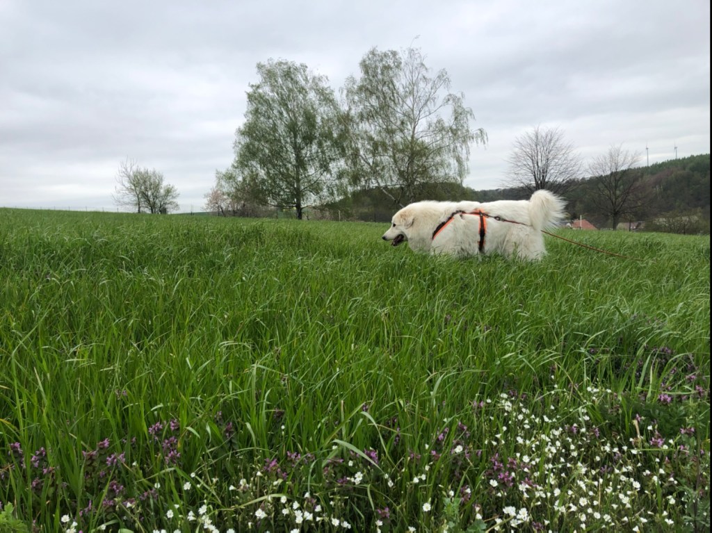 Dann sind wir noch zusammen über die Rehwiese am Wald gegangen. Aber die Rehe sind nicht da gewesen. Die habe ich aber dann im Wald gesehen, als wir über die ganze Rehwiese drüber waren. Und da bin ich losgerast. Mein großer Mensch hat mich aber gleich zurückgerufen. Und ich bin eine ganz brave Pyri. Ich bin gleich stehen geblieben und habe nur geguckt. Und dann bin ich zu meinem großen Mensch gelaufen. Da hat er mich gelobt! Danach sind wir nach Hause gegangen. Über die große Straße und die Wiese auf der anderen Seite.