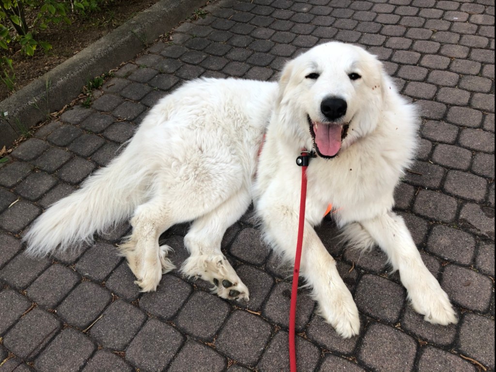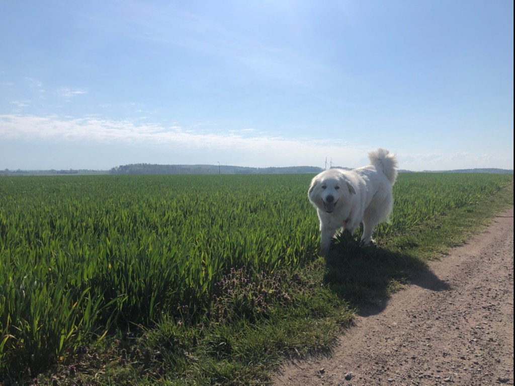 An der Fuchsfarm sind wir vorbei und dort haben wir Menschen getroffen. Die haben gesagt, daß die Bella ganz lieb und schön ist. Stimmt beides. Wir sind dann hinter der Fuchsfarm über die Wiese zum Skihaus gewandert. An der Fuchsfarm wohnen jetzt die Reiher. Ganz oben auf einem Baum. Die kann man vom Skihaus aus sehen. Dann ging es gleich weiter auf dem Weg zwischen den zwei kleinen Wäldchen. Und da war was im Wäldchen rechts vom Weg. Da wollte ich hinterher. Aber mein großer Mensch hat mich gleich zurückgerufen. Liebe Pyrenäenberghündinnen gehorchen. Die Bella ist eine liebe Pyrenäenberghündin.