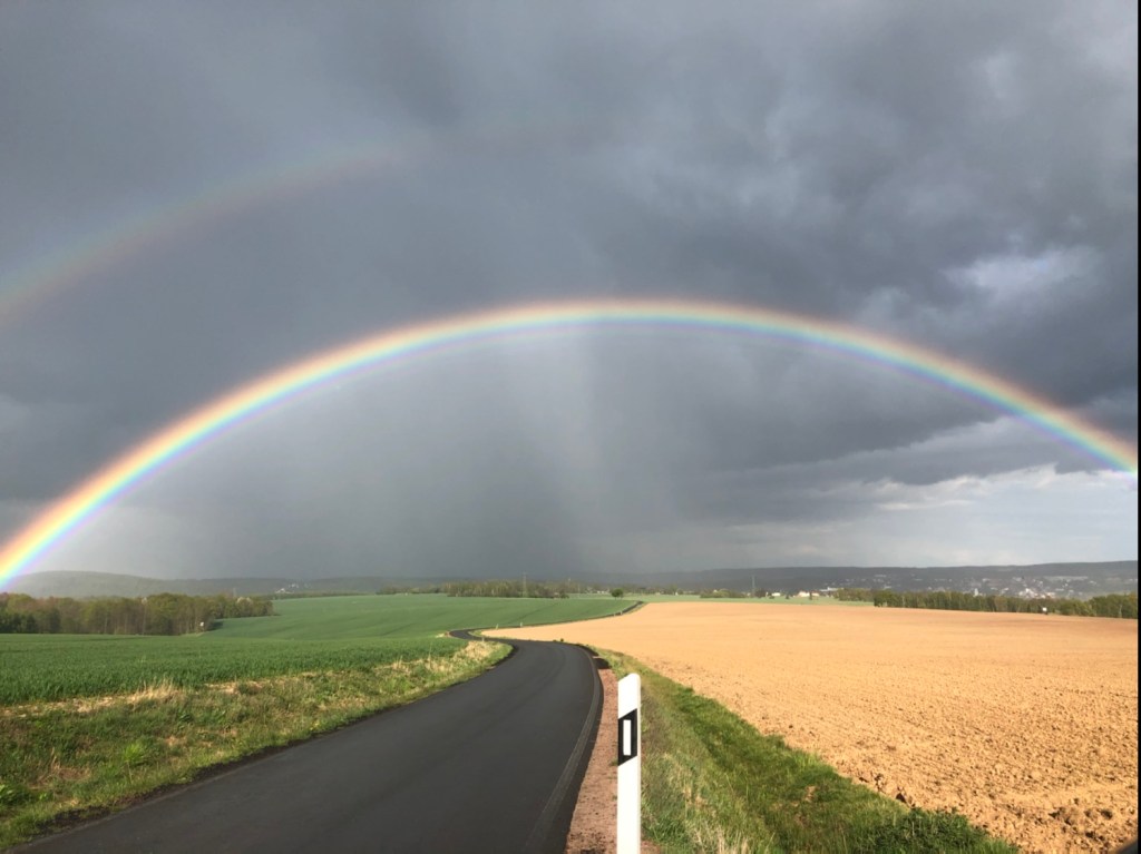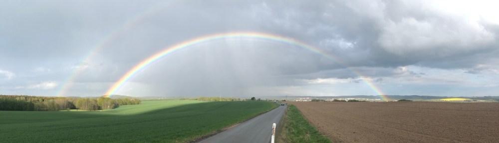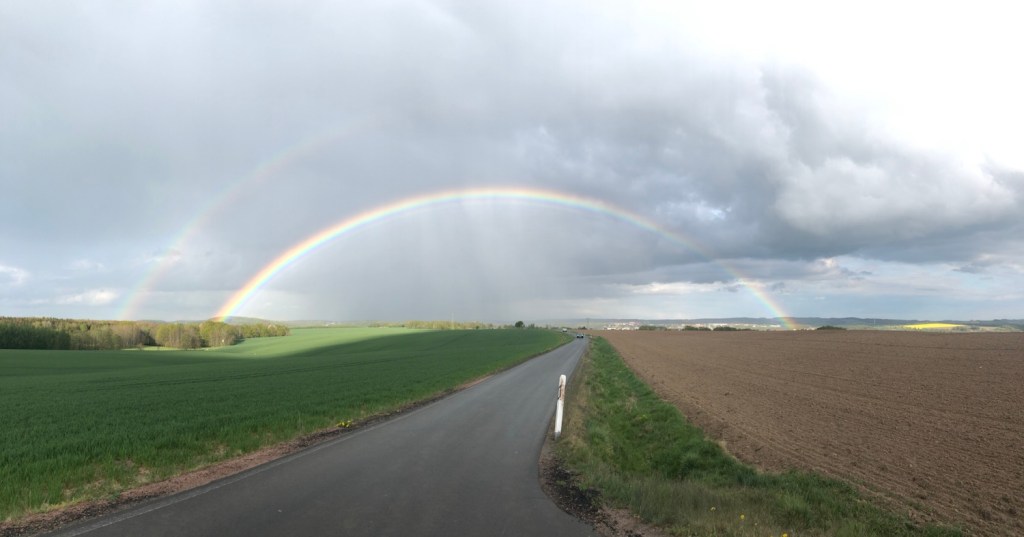 Nein, so schön sind die Bilder gar nicht. Leider. Der doppelte Regenbogen war kurz vorher viel schöner und kräftiger zu sehen, da hatte ich aber keine Möglichkeit anzuhalten. Aber so geht es auch.
