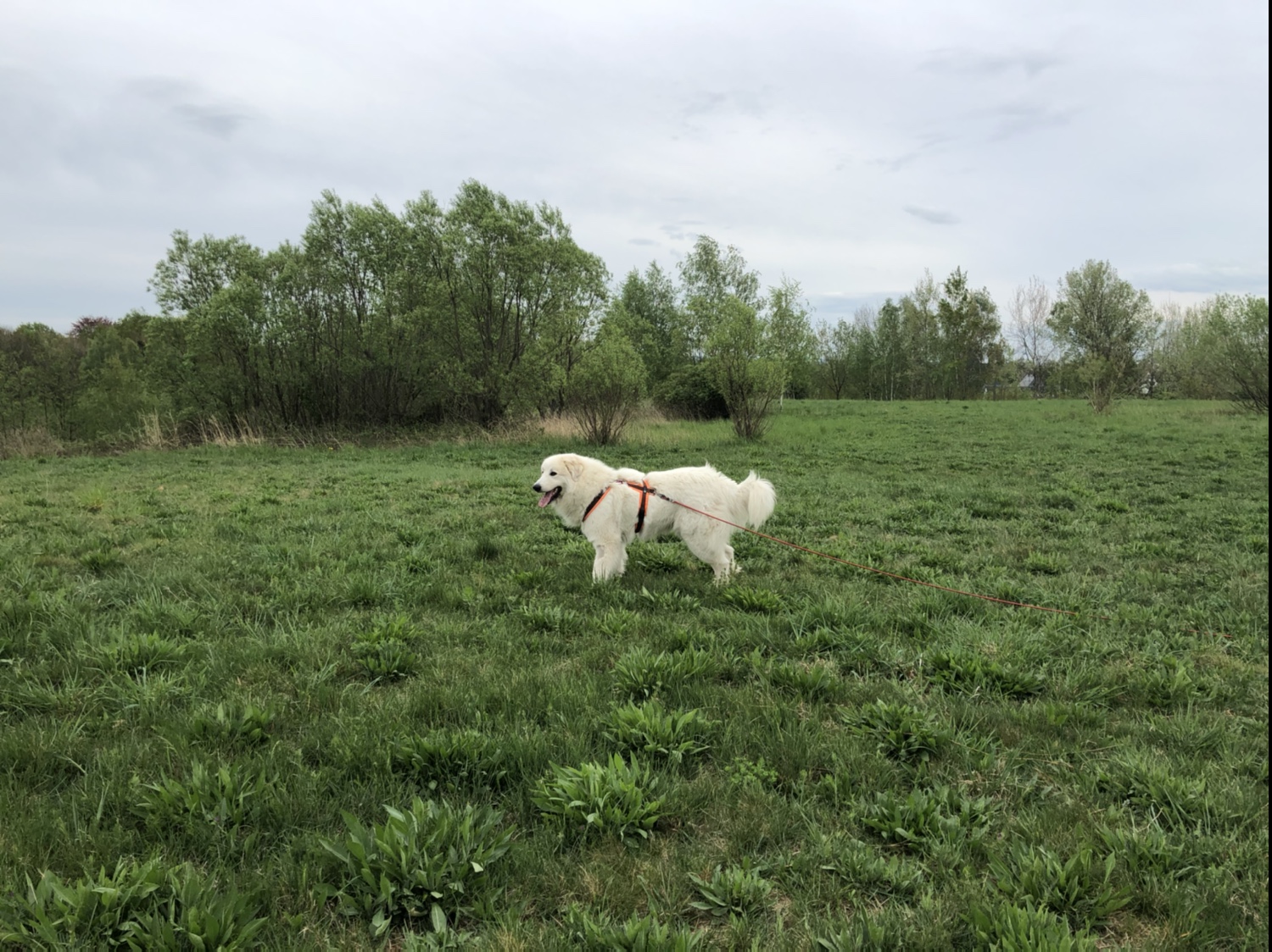 Dann sind wir über die große Wiese und da konnte ich hin jnd her flitzen und schnuffeln und dann ging es weiter am großen Teich vorbei und in Richtung Skihütte. Da habe ich dann mit meinem großen Mensch den Reiher beobachtet. Der ist gerade von seinem Nest weggeflogen. Wir sind dann den Skihang runter und an mein kleines Bächlein. Da habe ich getrunken. Evian! Das ist Wasser. Französianisches. Ich bin eine Französianerine. Eine Pyrenäenberghündin! Mein Papi, der Hadrien, der kommt aus den Pyrenäen. Und da wohnt auch meine Omi, die Mami von meinem Papi. So ist das nämlich!
