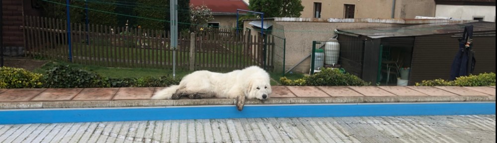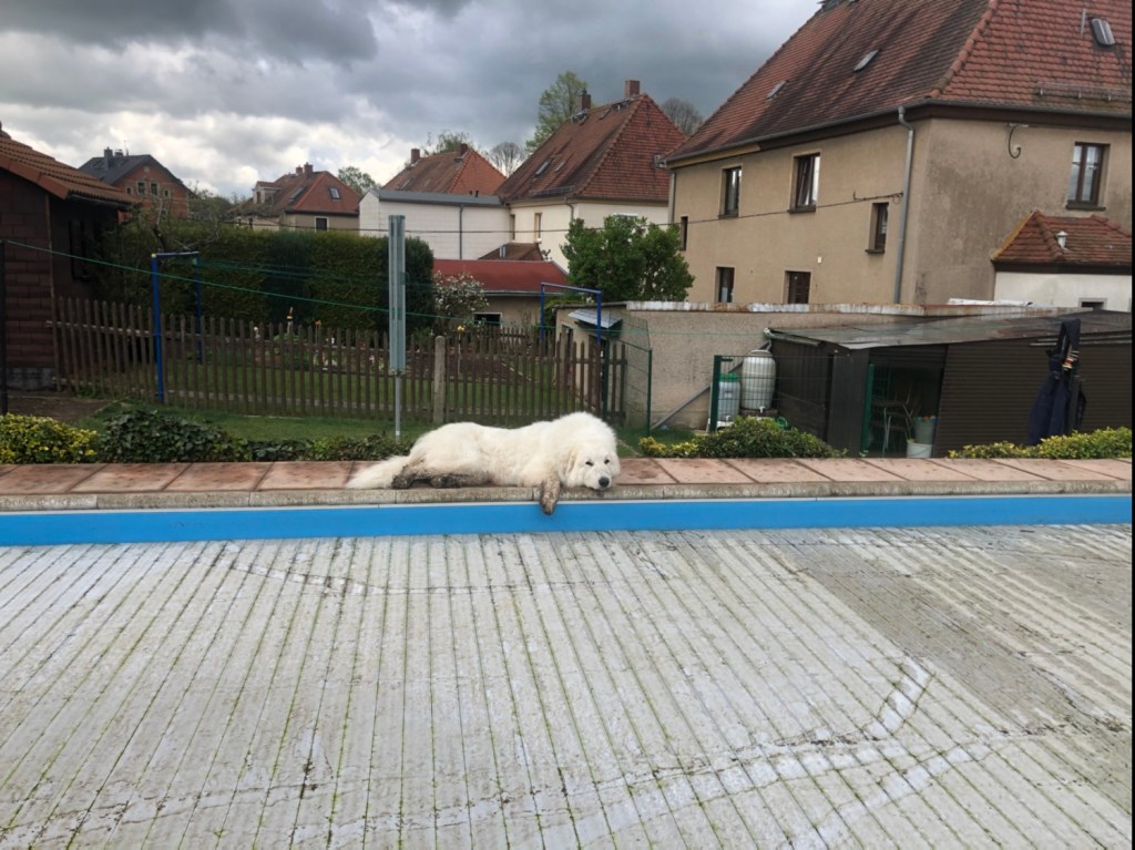 Und nach dem Mittag habe ich mit meinem großen Mensch den Pool für den Sommer fertig gemacht. Da hat mein großer Mensch den ganzen Deckel vom Pool und rundherum die Steinplatten mit dem lauten Wassersprüher ganz sauber gemacht. Die Bella hat ganz fein aufgepaßt, wie man das macht. Und meine große Menschen hat inzwischen die Wiese in meinem Garten verhübscht.