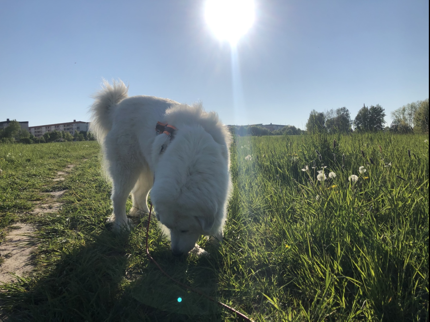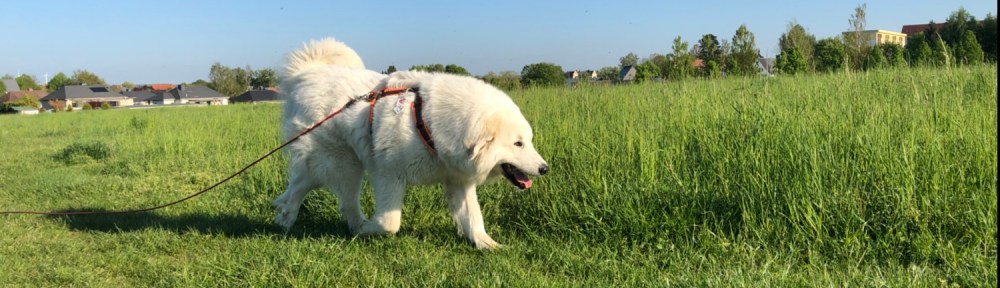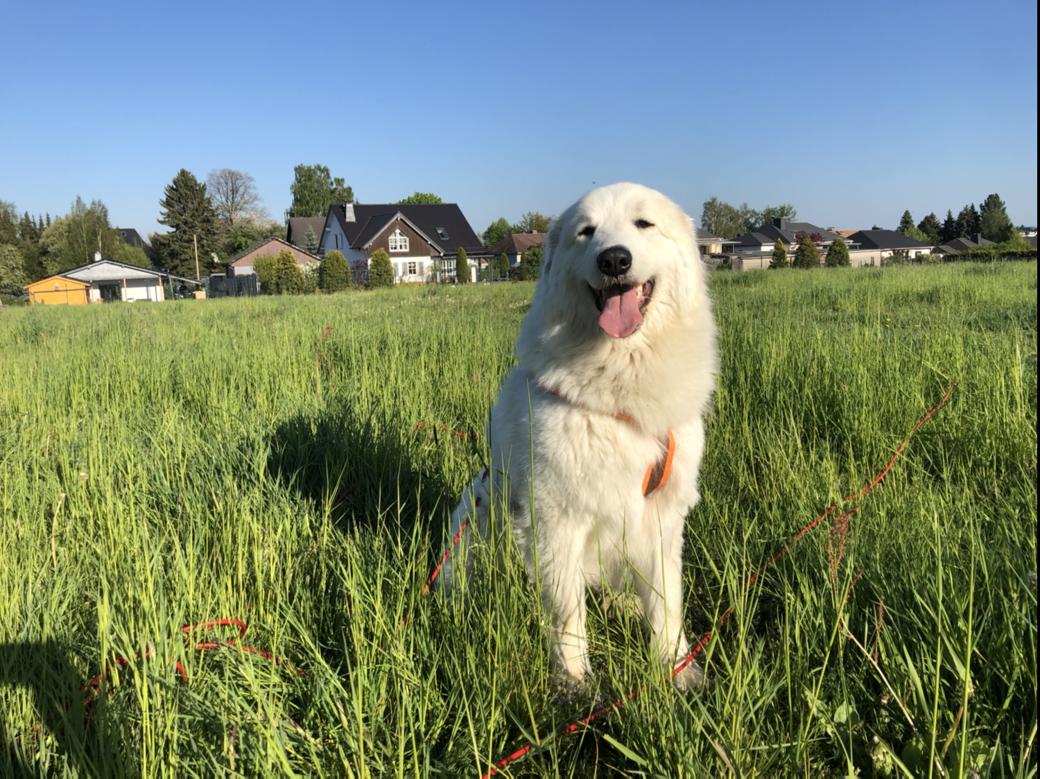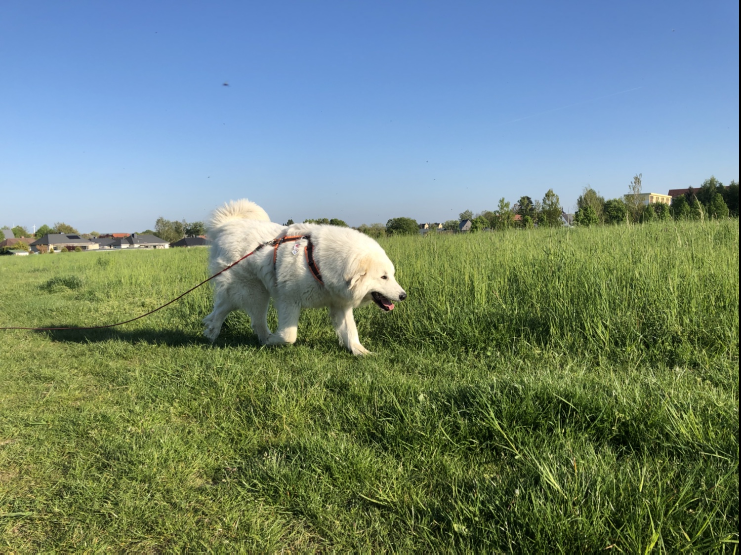 Zuerst ging es durch mein Wohngebiet. Mein großer Mensch wollte dann nur eine Runde über die Wiesen laufen und wieder zurück. Aber ich bin erstmal schön über die ganze große Wiese geschnuffelt und dann habe ich meinen großen Mensch weiter zum Teich geführt. Ich bin sehr willensstark! Eine Führungspersönlichkeit bin ich! Eine Herdenschutzhündin! Ich bin eine Pyri!