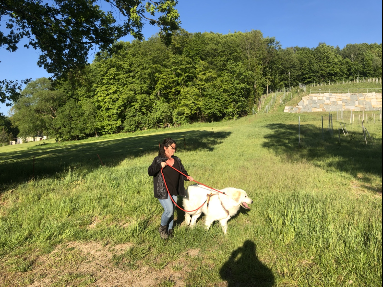 Heute haben wir die Frau Nachbarin abgeholt. Die ist auch mitgegangen. Wir sind dann zur Wiese auf der andern Seite von der großen Straße. Also gegenüber von meiner großen Feldwiese und dann sind wir die große Straße lang. Da wußte ich schon, wo es hingeht. Meine große Menschin hat geführt. Weiiil, mein großer Mensch muß noch vorsichtig machen. Der durfte nur gemütlich mitspazieren.