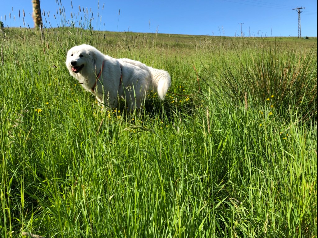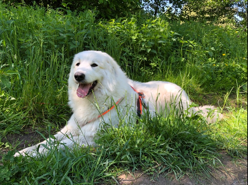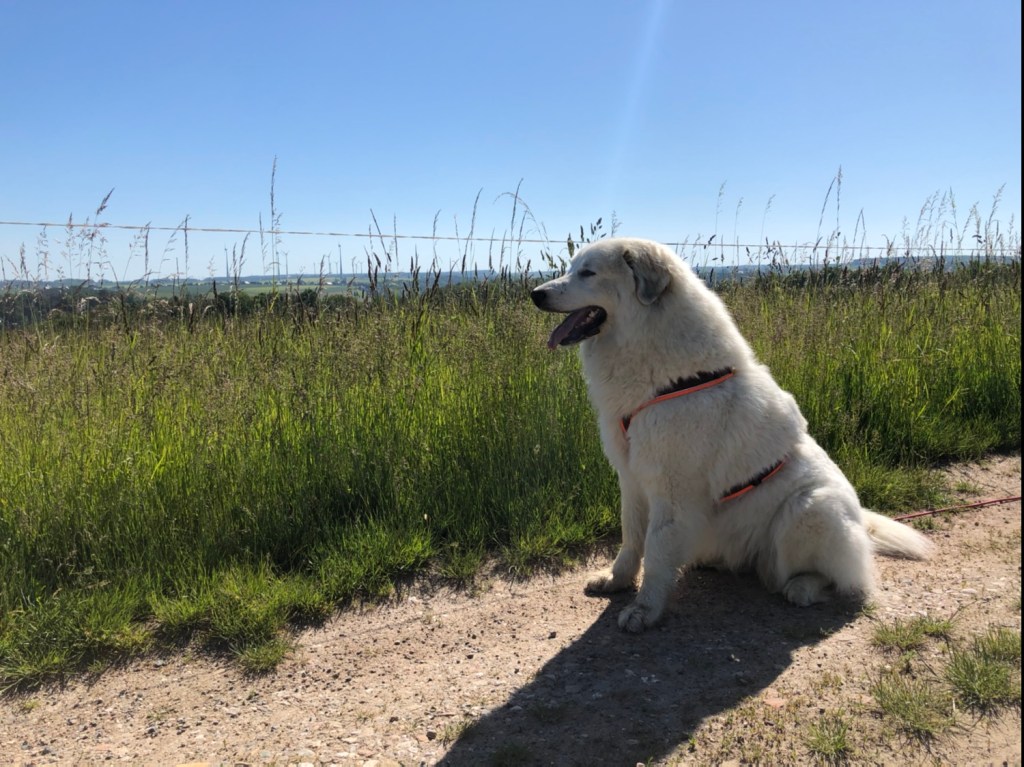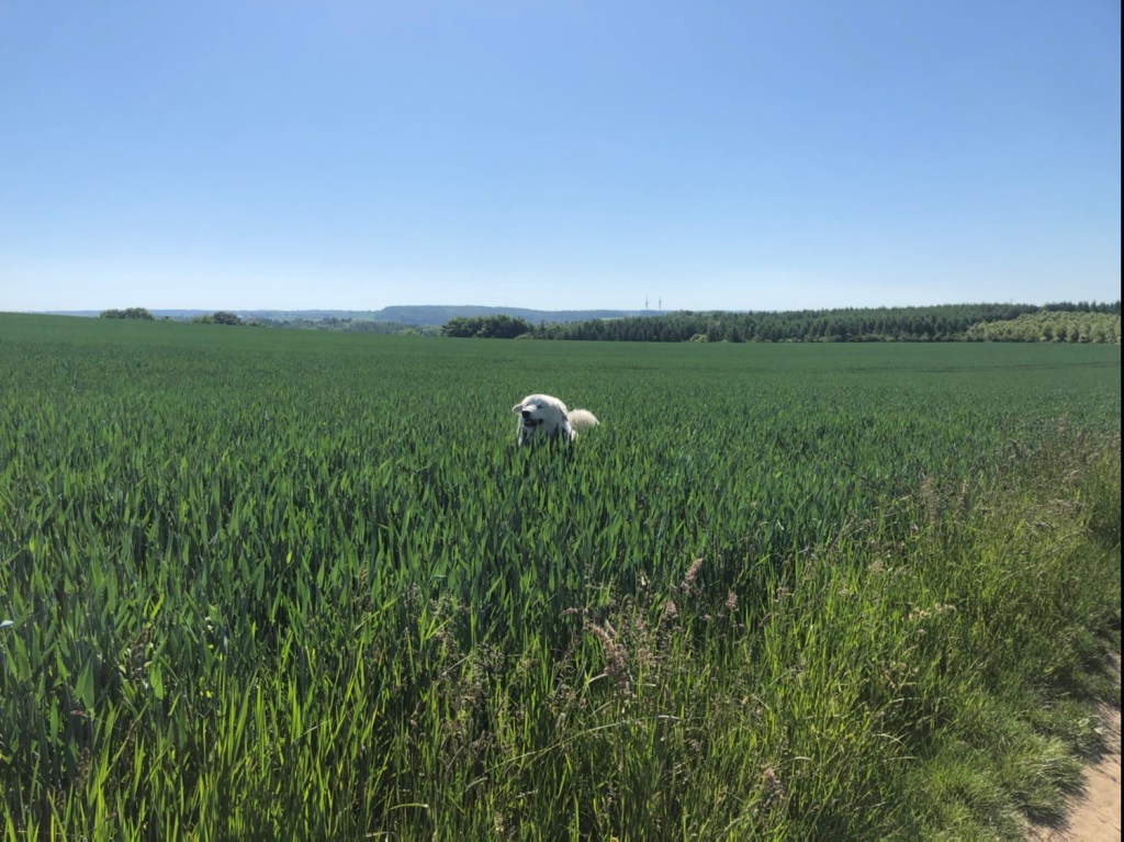 Und da haben wir dann ein Reh gesehen. Direkt neben uns. Das hat gefuttert. 20 Meter von uns entfernt. Oder 30, höchstens. So genau weiß ich das nicht. Ich bin eine Pyrenäenberghündin, kein Vermessungsingenieur. Das spricht man Vermessungsingschenööör. So sagen das die Menschen. Das habe ich gehört. Das Reh ist dann aber weggerannt, als es uns entdeckt hat. Da wollte ich natürlich hinterher. Durfte ich aber nicht. Dafür sind wir durch ganz hohes Gras zurück zur Straße.