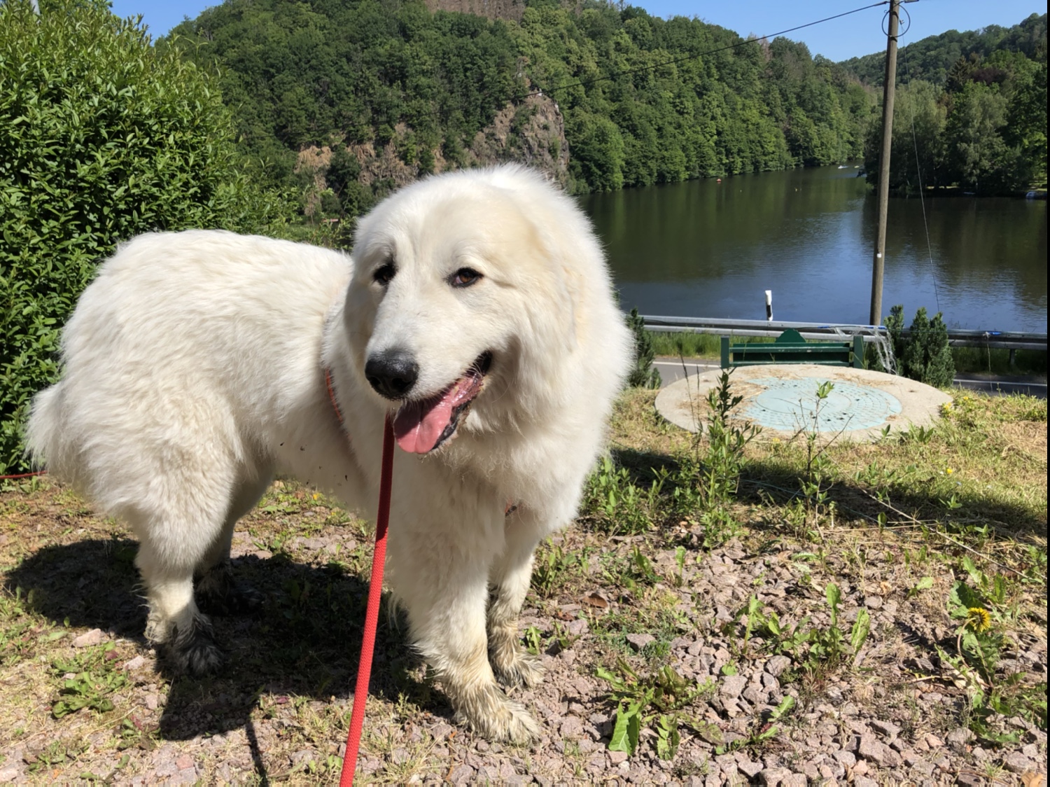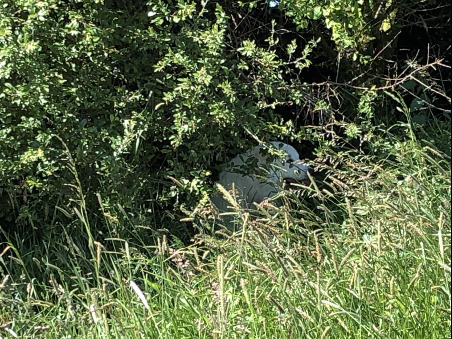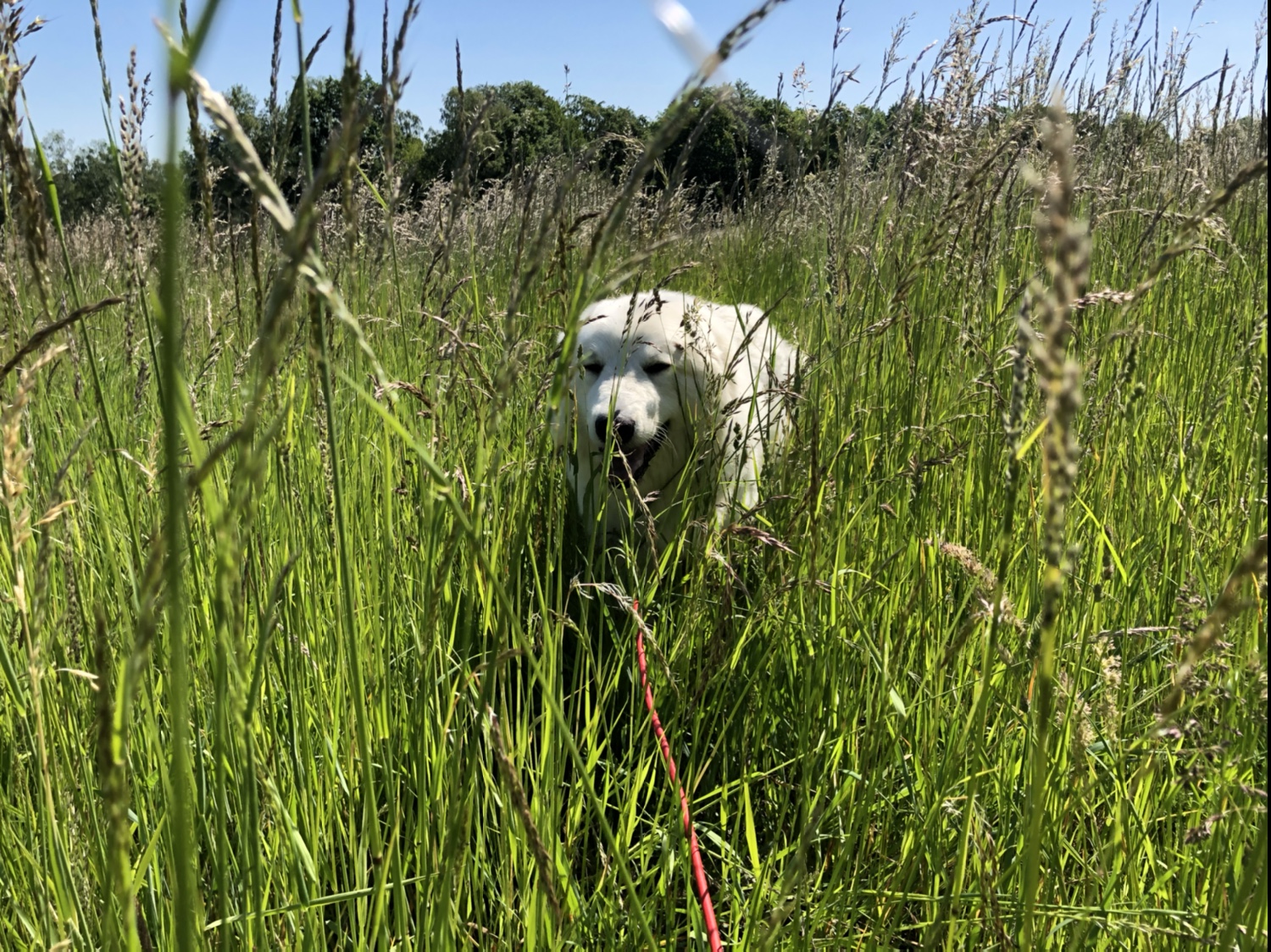 Und da haben wir dann ein Reh gesehen. Direkt neben uns. Das hat gefuttert. 20 Meter von uns entfernt. Oder 30, höchstens. So genau weiß ich das nicht. Ich bin eine Pyrenäenberghündin, kein Vermessungsingenieur. Das spricht man Vermessungsingschenööör. So sagen das die Menschen. Das habe ich gehört. Das Reh ist dann aber weggerannt, als es uns entdeckt hat. Da wollte ich natürlich hinterher. Durfte ich aber nicht. Dafür sind wir durch ganz hohes Gras zurück zur Straße.