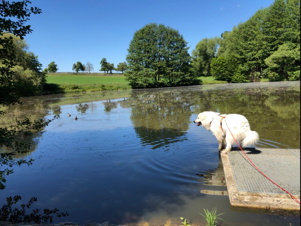 Wir sind wieder zur großen Wiese hinter meinem Wohngebiet gegangen, dann vorbei an der kleinen Wiese und zum Teich. Da habe ich erstmal kurz was getrunken und dann sind wir wieder den Feldweg lang. Ich bin da kurz durch das Feld gehoppelt. Darf man aber nicht. Deshalb bin ich gleich wieder rausgekommen. Bevor jemand schimpft.