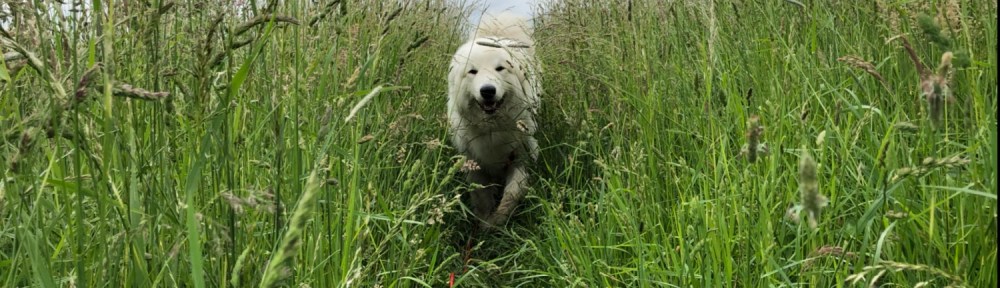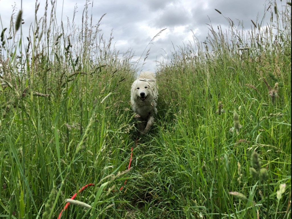 Und dann sind wir losgewandert. Erstmal durch mein Wohngebiet. Und dann über die große Wiese hinter meinem Wohngebiet und vorbei an der kleinen Wiese bis zum Teich. Da habe ich erstmal schön getrunken. Wir sind dann weiter zwischen den Feldern bis zur kleinen Straße und die sind wir ein Stück weitergelaufen. Und dann ging es quer über die Wiese. Durch ganz hohes Gras. Das gefällt der Bella.