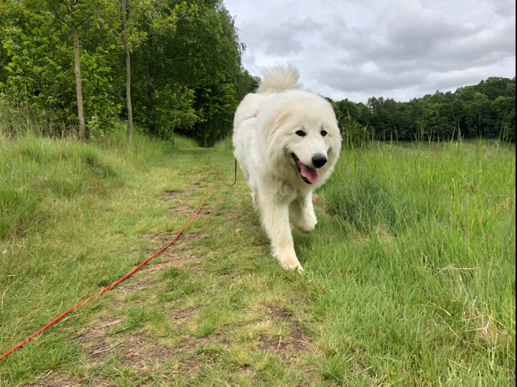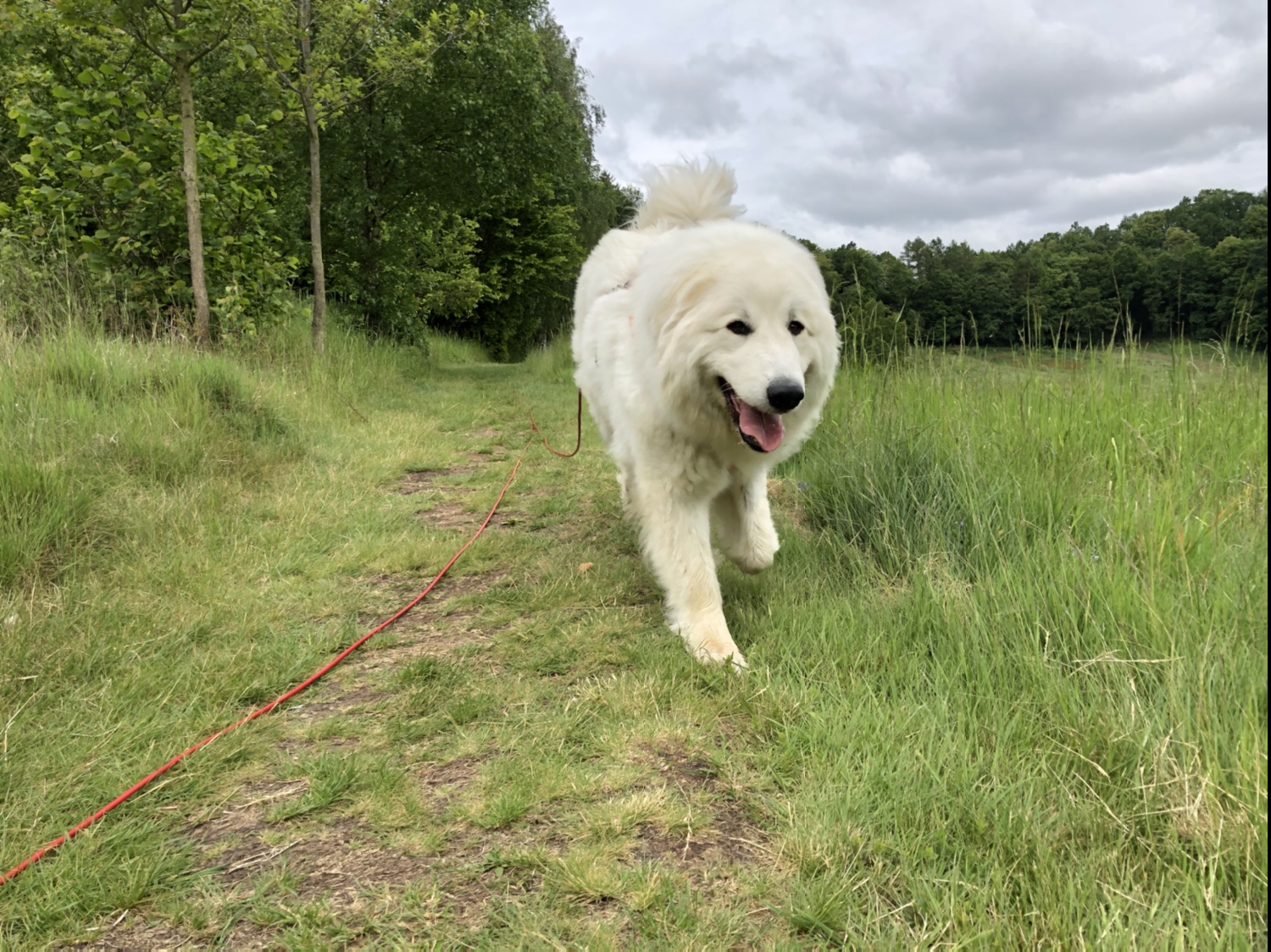 Am „Waldhaus“ waren heute ganzganz viele Menschen. Und ein Hund war auch da. Der lief vor uns. Ich war aber ganz ruhig und lieb. Und von dem „Waldhaus“ aus sind wir dann schön durch den Wald zur Fuchsfarm gewandert. Da habe ich den Hund von weitem dann wieder gesehen. An der Fuchsfarm vorbei sind wir noch zum kleinen Bächlein gegangen und da habe ich getrunken. Wasser. Evian! Ich bin eine Französianerin! Eine Pyrenäenberghündin bin ich! Und dann sind wir durch den Wald und mein Wohngebiet nach Hause gegangen.