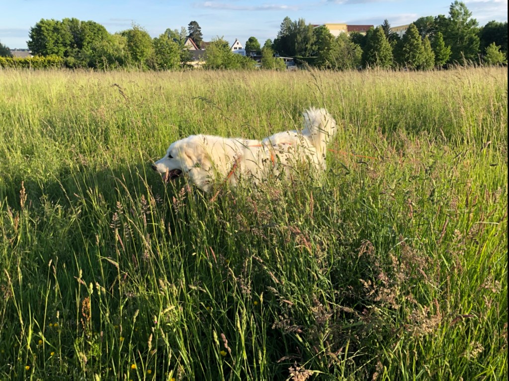 Unseren Abendspaziergang habe ich mit meinem großen Mensch heute ganz spät gemacht. Da sind wir wieder zur Wiese hinter meinem Wohngebiet gegangen. Und ich bin durch das hohe Gras gestrolcht und habe ganz viel geschnuffelt. Auf dem Heimweg habe ich mich dann auf die Wiese am Rand von dem Spielplatz gelegt und da haben wir andere Hunde beobachtet, die auch da waren. Dann bin ich mit meinem großen Mensch wieder quer durch das ganz hohe Gras gelaufen. Da haben wir gar nicht gesehen, wo es lang geht. Wir haben aber trotzdem wieder nach Hause gefunden. Und das hat mir ganz viel Spaß gemacht.