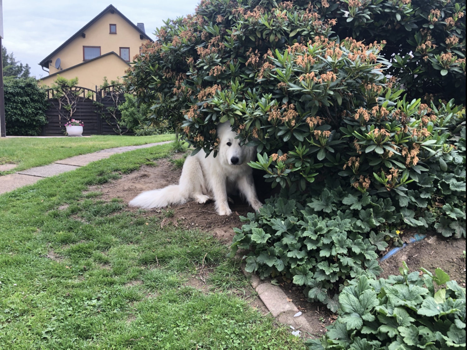 Dann sind wir aber doch zu meinem weißen französianischen Auto gegangen, nachdem mich mein großer Mensch angezogen hatte. Und da sind wir zum Training gefahren. Ich habe wieder brav in meinem weißen französianischen Auto gewartet, bevor es losging.