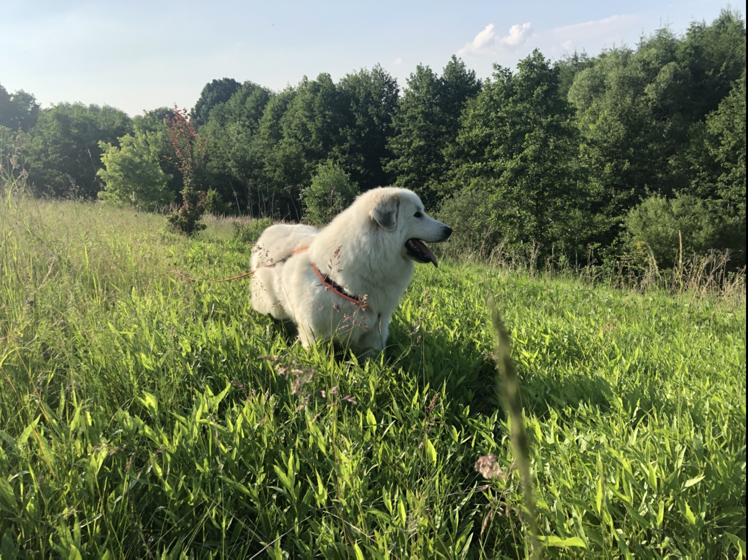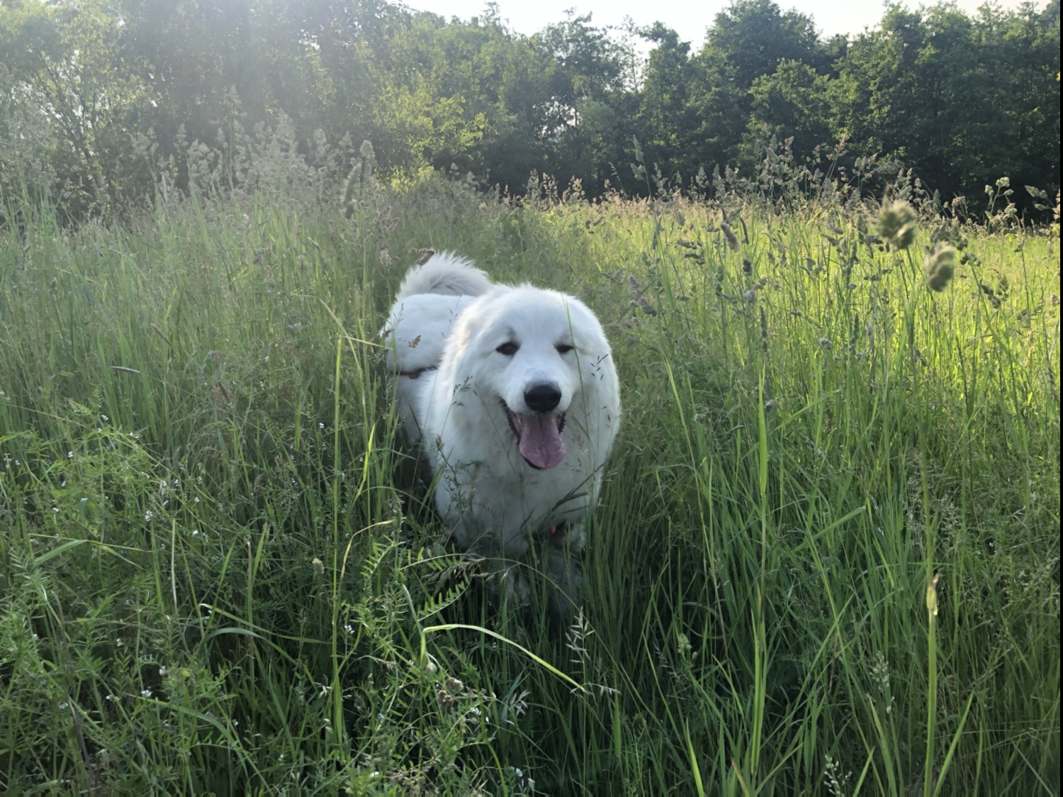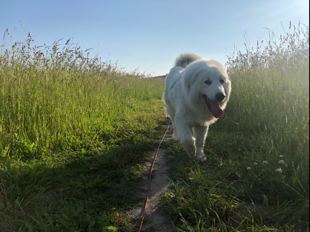 Abends haben wir dann noch einen schönen Abendspaziergang gemacht. Durch mein Wohngebiet zur großen Wiese hinter dem Wohngebiet. Und dann sind wir durch das ganz hohe Gras auf der kleinen Wiese gehopst, mein großer Mensch und ich, die Bella. Auf dem Heimweg haben wir dann den Gizmo getroffen.