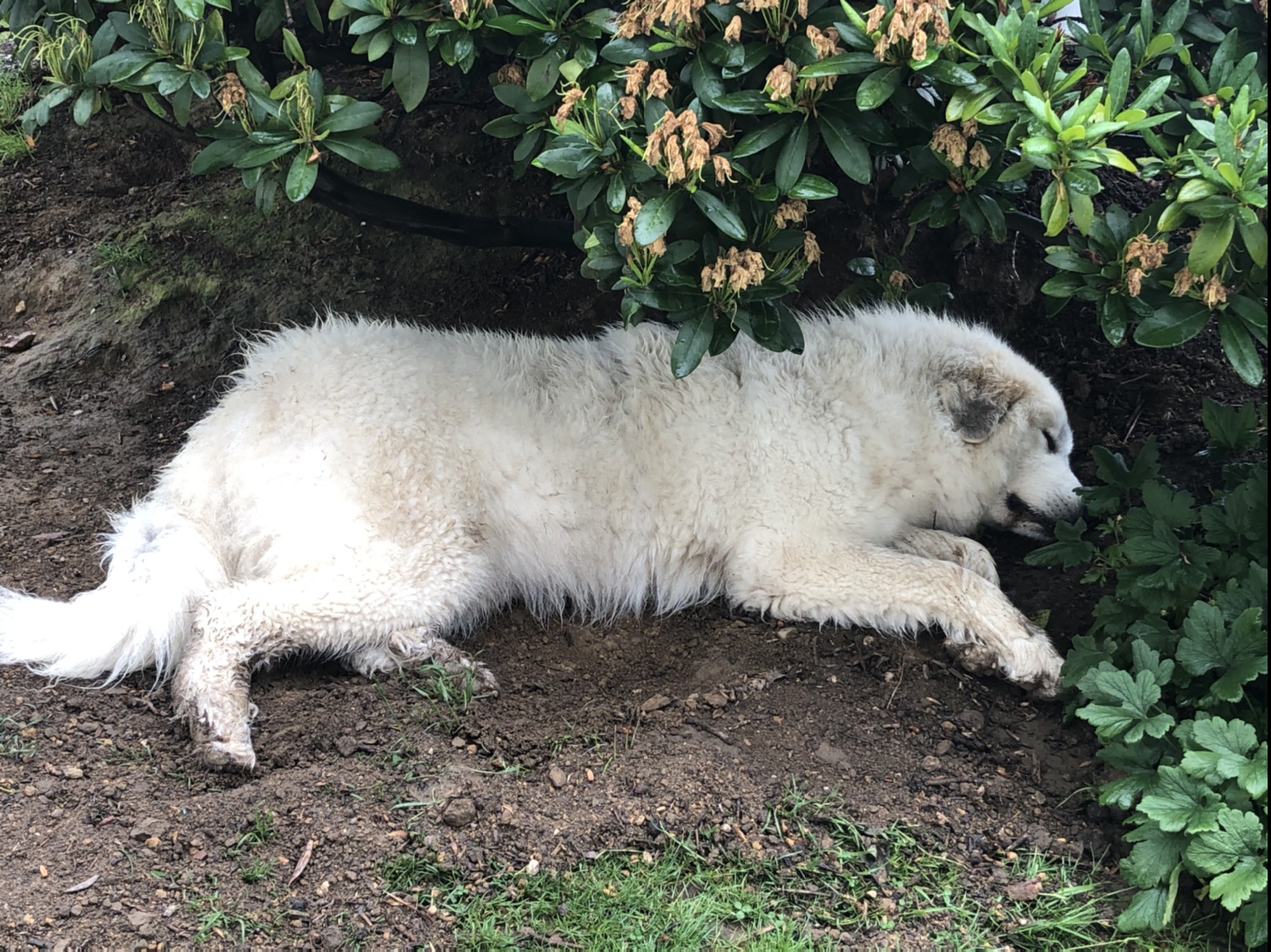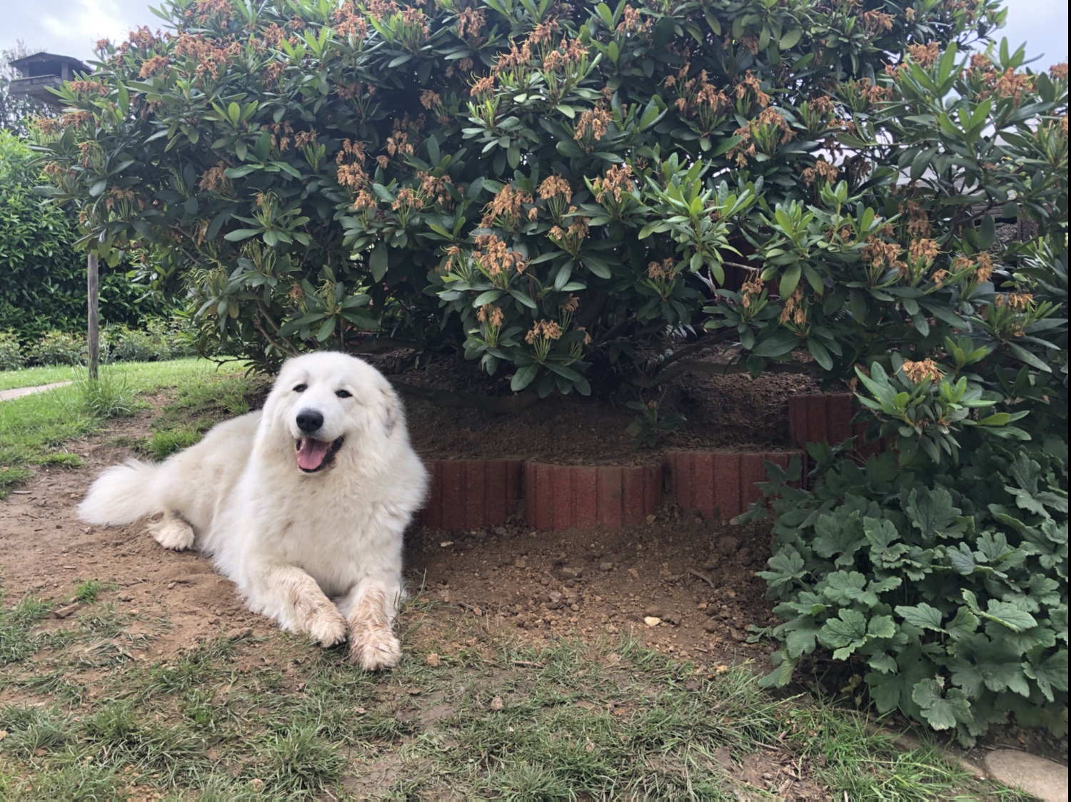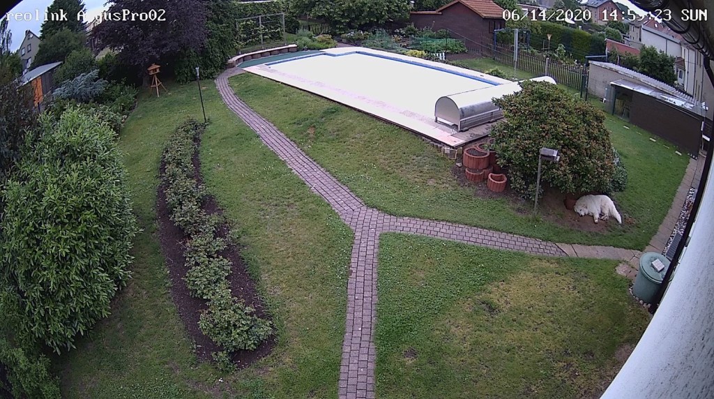 Ich habe mich dann schön ausgeruht und nachmittags hat es auch nicht mehr geregnet. Meine großen Menschen haben weiter an meinem Pool und am Liegeplatz gebaut. Ich habe aufgepaßt. Aber ich muß jetzt kaum noch schimpfen. Und dann habe ich schon mal auf meinem neuen Liegeplatz unter meinem Roten Dendron ein Probeliegen gemacht. Mit Probeschlummern!