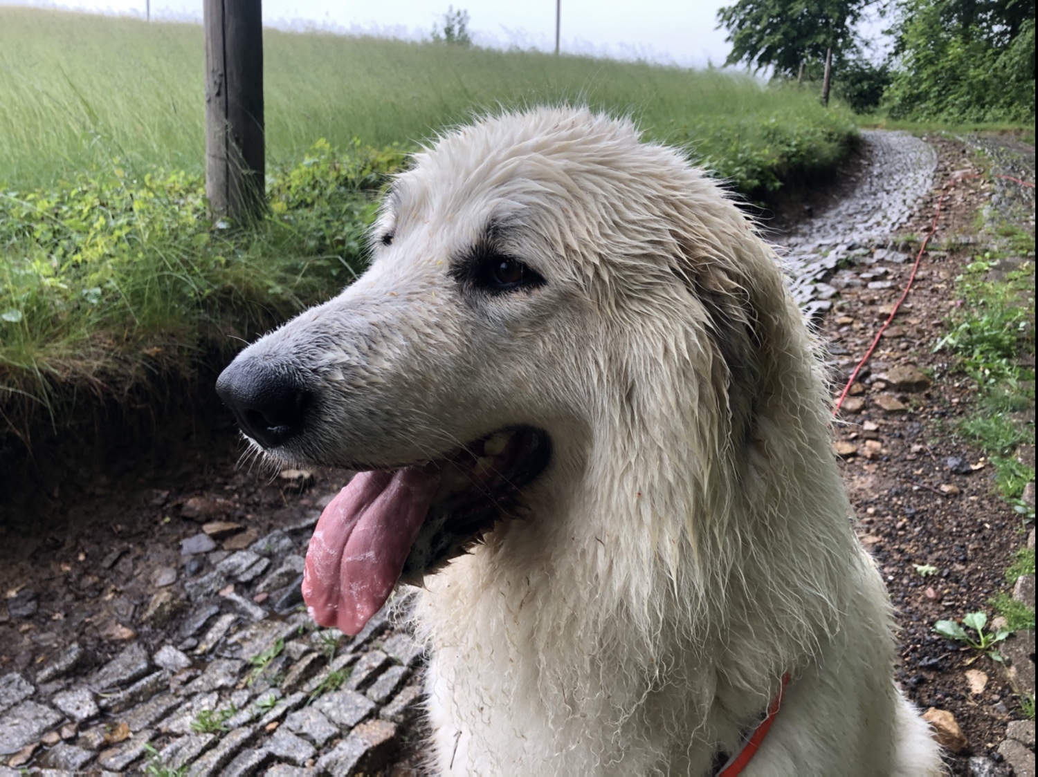 Wir sind dann weiter an der kleinen Wiese vorbei. Da ist das Gras noch ganz hoch. Und weiter zum Teich. Da hat es auch geregnet. Und da sind wir weiter zwischen den Feldern auf dem Feldweg. Ich durfte überall schnuffeln. Dann sind wir ein Stück die kleine Straße lang und zur Fuchsfarm. Dort habe ich getrunken. Wir waren ganz naß.