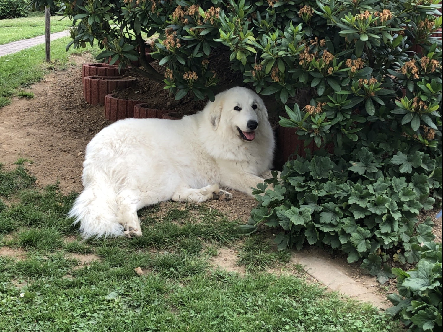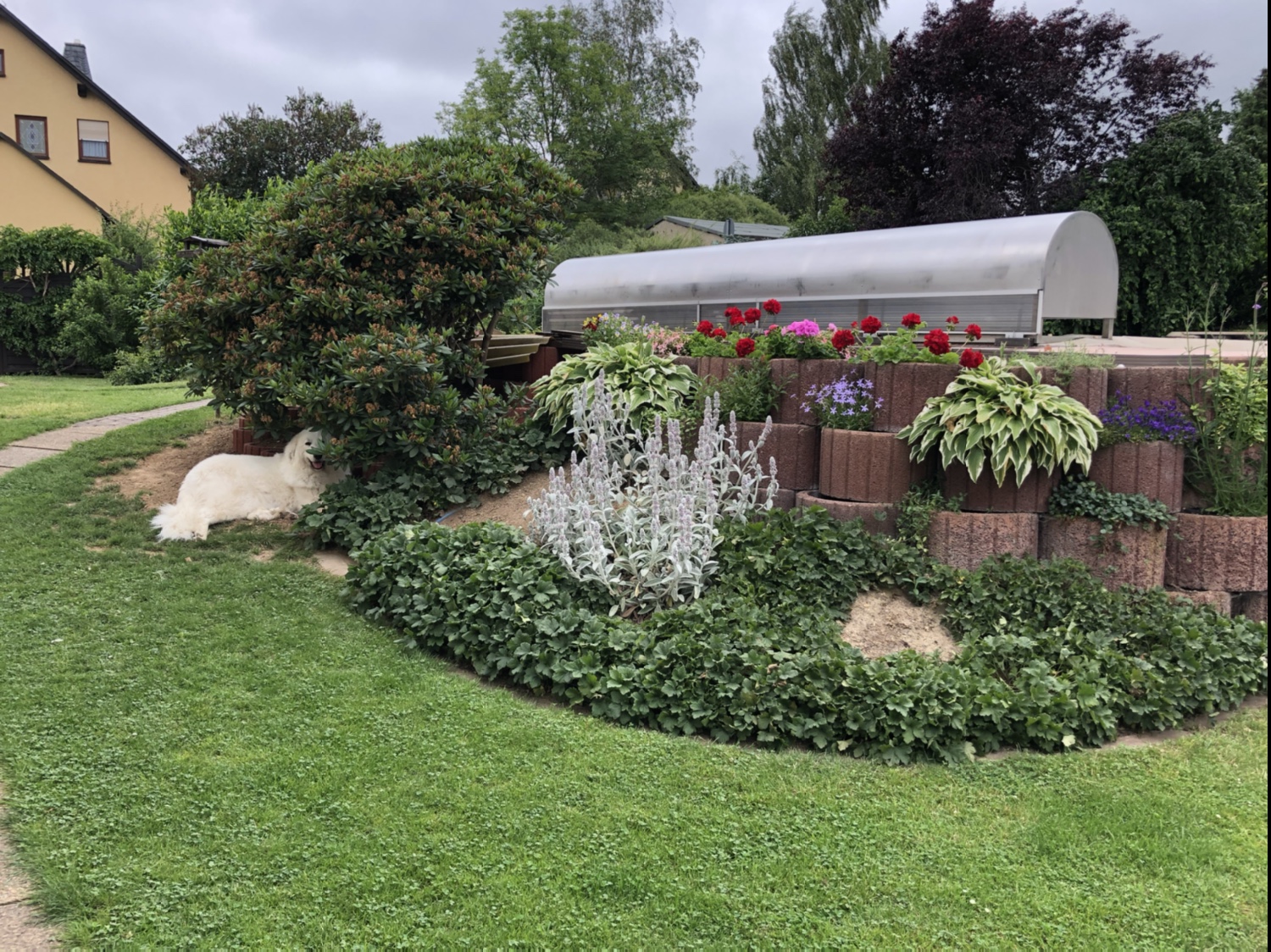 Heute war erstmal ganz liebes Wetter. Nur nachmittags war der Himmel traurig und hat angefangen zu weinen. Ich bin in meinem Garten gewesen. Da habe ich auf meinem neu gebauten Liegeplatz unter meinem Roten Dendron gelegen. Und nachmittags bin ich bei meiner großen Menschenschwester im Haus gewesen.