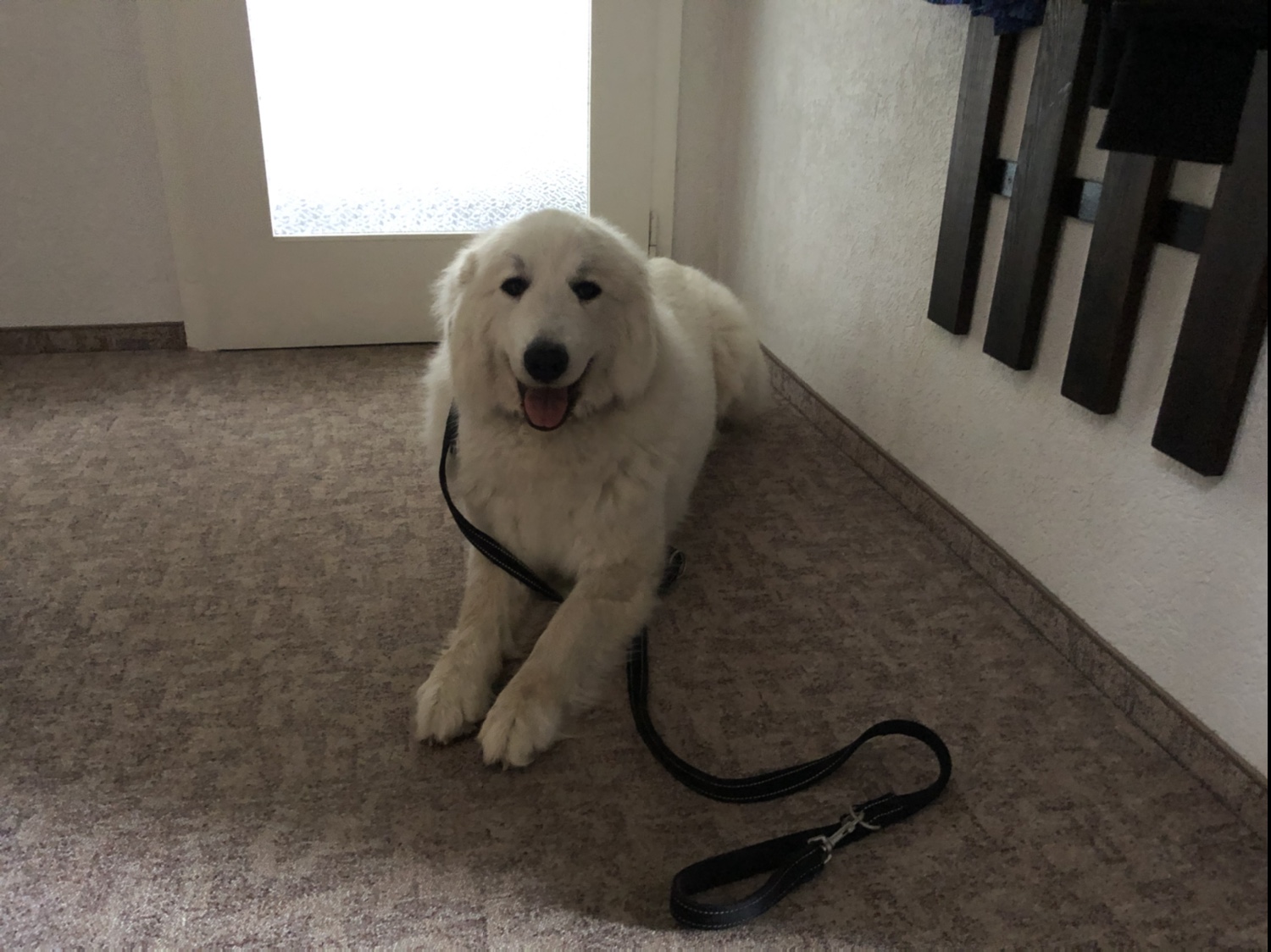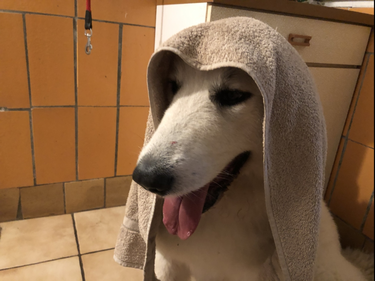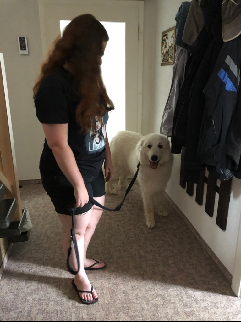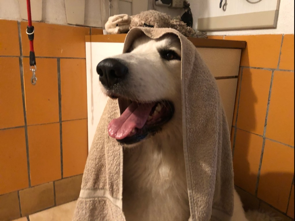 Wir sind noch kurz durch meinen Garten gegangen und dann in meine Kellerwohnung. Da habe ich eine Belohnung bekommen und dann hat mein großer Mensch seine liebe Pyri, also mich, trockengerubbelt. Besonders mein kleines stures Pyriköpfchen!