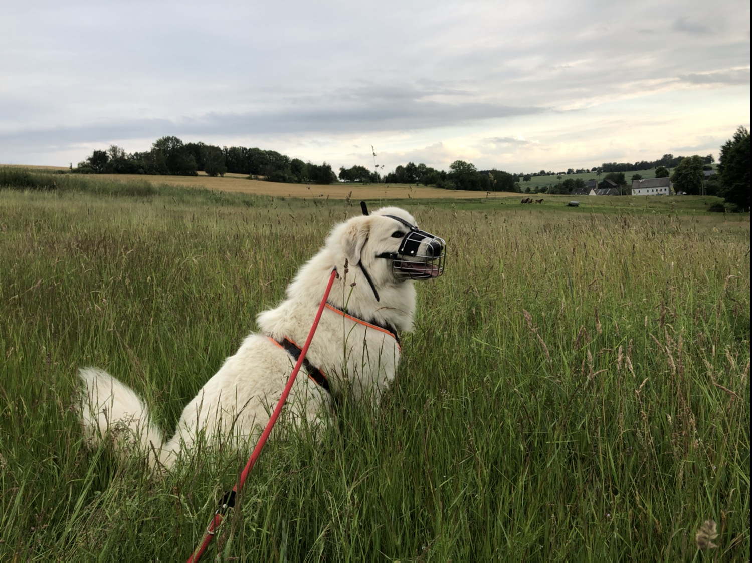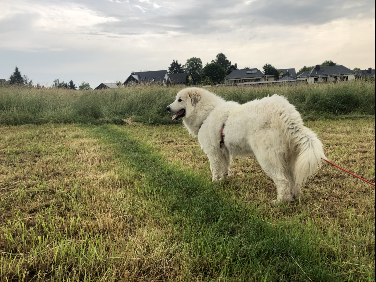 Wir sind dann zu der großen Wiese hinter meinem Wohngebiet gegangen. Es hat ganz wenig geregnet als wir los sind. Dann hat es aber aufgehört. Wir sind ziemlich ganz alleine gewesen. Nur einen schwarzen Hund mit seiner Menschin haben wir von weitem gesehen. Der war auch auf der großen Wiese. Die große Wiese ist jetzt zur Hälfte eingekürzt. Die andere Hälfte hat noch ganz hohes Gras.