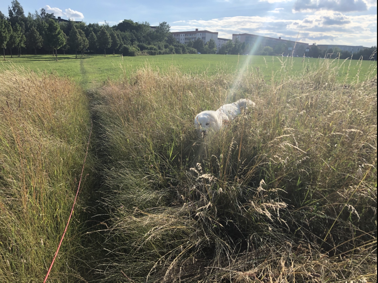 Wir sind erst durch mein Wohngebiet gelaufen. Bis zur großen Wiese hinter meinem Wohngebiet. Und da durfte ich dann eine ganz große Runde über die ganze Wiese schnuffeln. Ganz viel Zeit haben wir uns genommen. Auf dem Heimweg haben wir erst den Gizmo getroffen. Der hat mich erst angeschimpft. Aber dann hat er mich erkannt und war ganz lieb. Ich bin ja auch ganz lieb. Ich habe mich erstmal ausgeruht und was getrunken. Aus meiner Trinkflasche. Evian! Ich bin eine Französianerin!