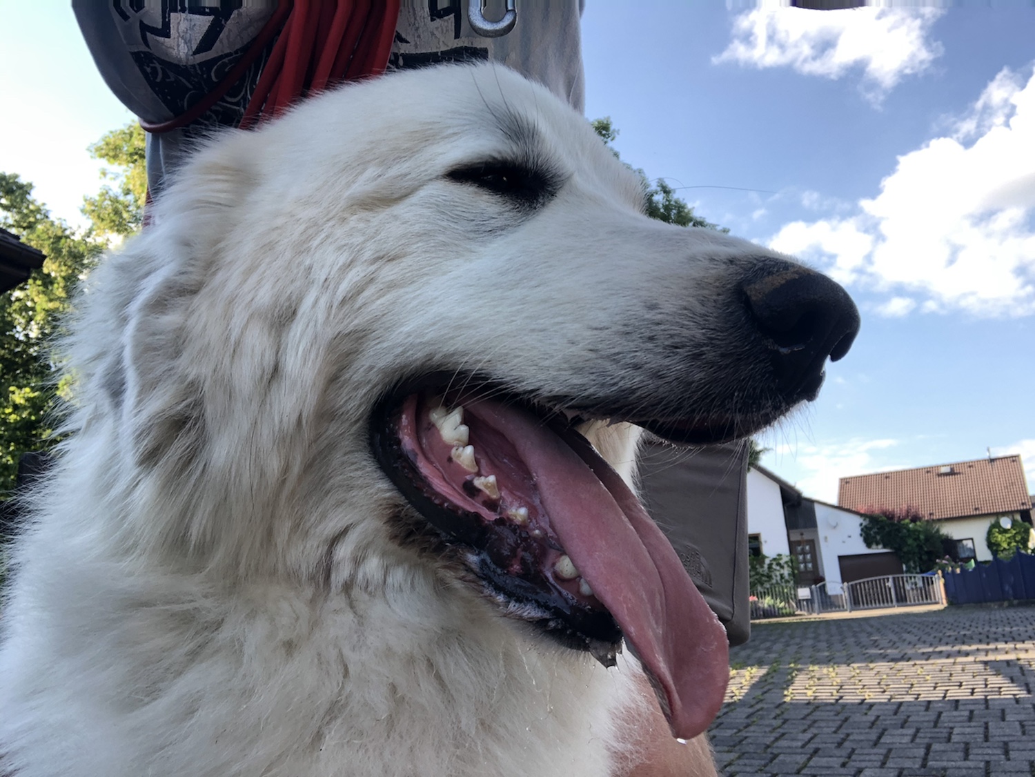 Tagsüber bin ich wie immer in meinem Garten gewesen. Meistens mit Menschenomi und Menschenopi auf meiner Terrasse. Da ist es immer schön schattig und kühl und ich kann fein schlummern und meinen Garten bewachen. Ich bin eine Herdenschutzhündin und da passe ich auf alles auf. Mir entgeht nichts.