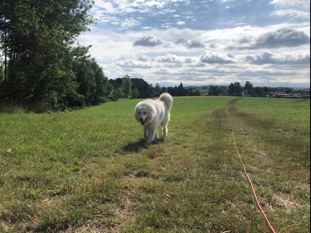 Und dann haben wir einen Morgenspaziergang gemacht. Nur mein großer Mensch und ich, die Bella. Es war noch ganz zeitig. Wir sind durch mein Wohngebiet gelaufen zu der großen Wiese hinter meinem Wohngebiet. Da war schon ein kleines weißes Hündchen spazieren. Das hat mich kurz von weitem angebellt. Ich war aber ganz ruhig und habe geschnuffelt.
