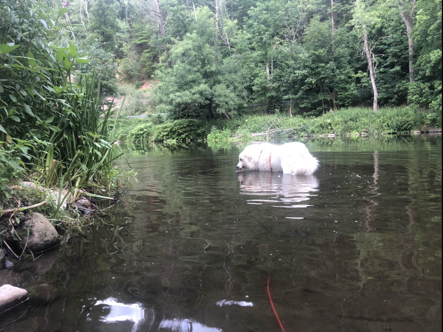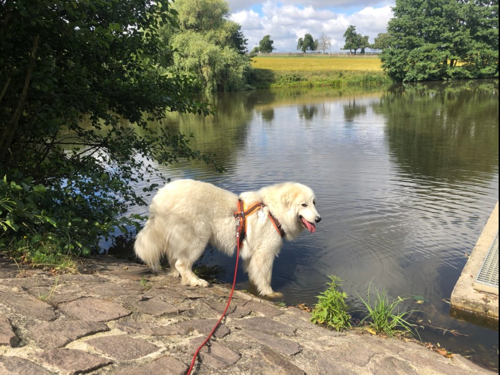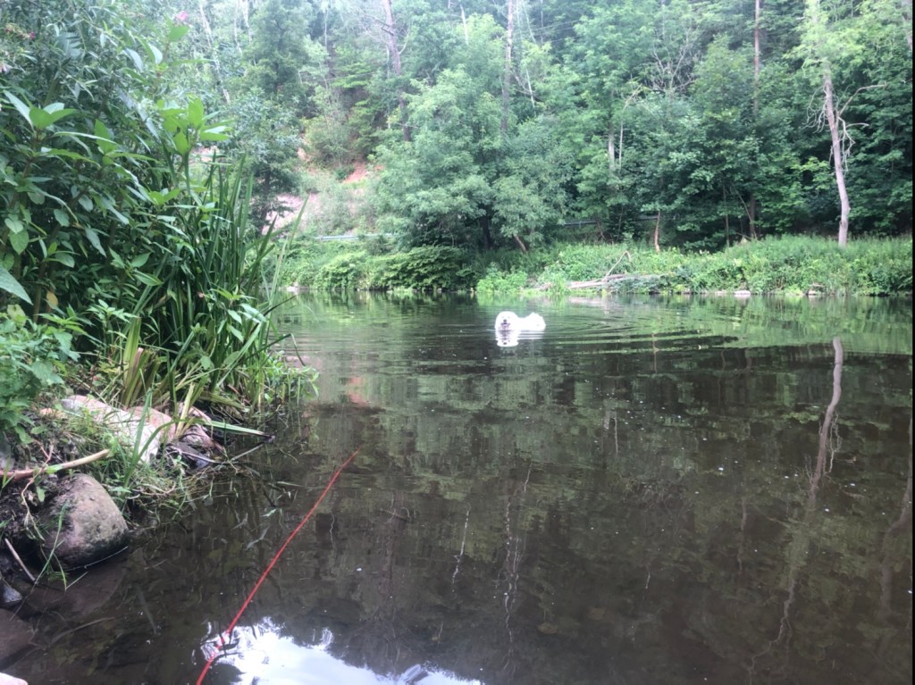 Wir sind dann den ganzen Feldweg bis nach Kockisch gelaufen. Da haben wir ein paar Leute getroffen und der Kalle war auch wieder ganz aufgeregt in seinem Garten. An meiner ersten Badestelle an der Wackelbrücke konnte ich gar nicht in den großen Fluß mit dem komischen Namen, weiiil, da waren wieder die Fischejäger. Da sind wir weiter zu meiner zweiten Badestelle. Der ganz schönen. Wo ich schwimmen kann.