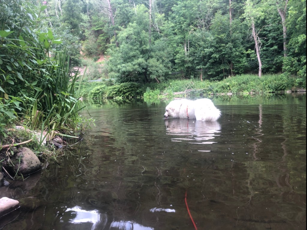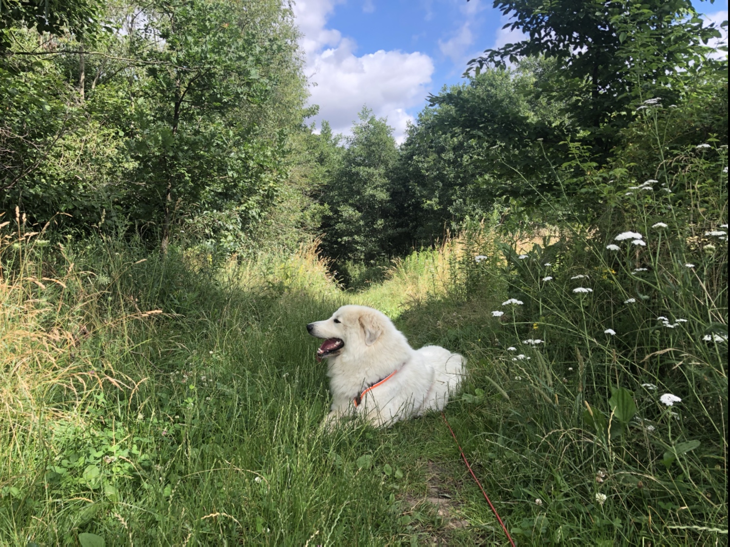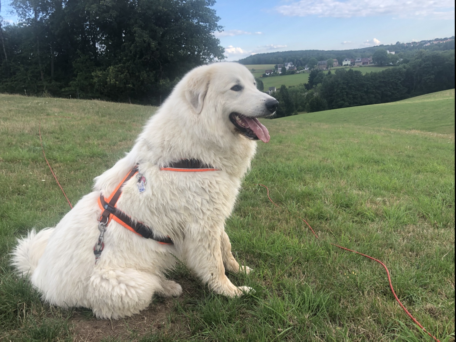 Am Skihang sind wir abgebogen und zurück zum Teich. Da habe ich gleich nochmal was getrunken. Dann sind wir wieder einen großen Bogen über die große Wiese zurück zu meinem Wohngebiet gegangen. Unterwegs habe ich mich auch mal ausgeruht. Aber nur kurz.