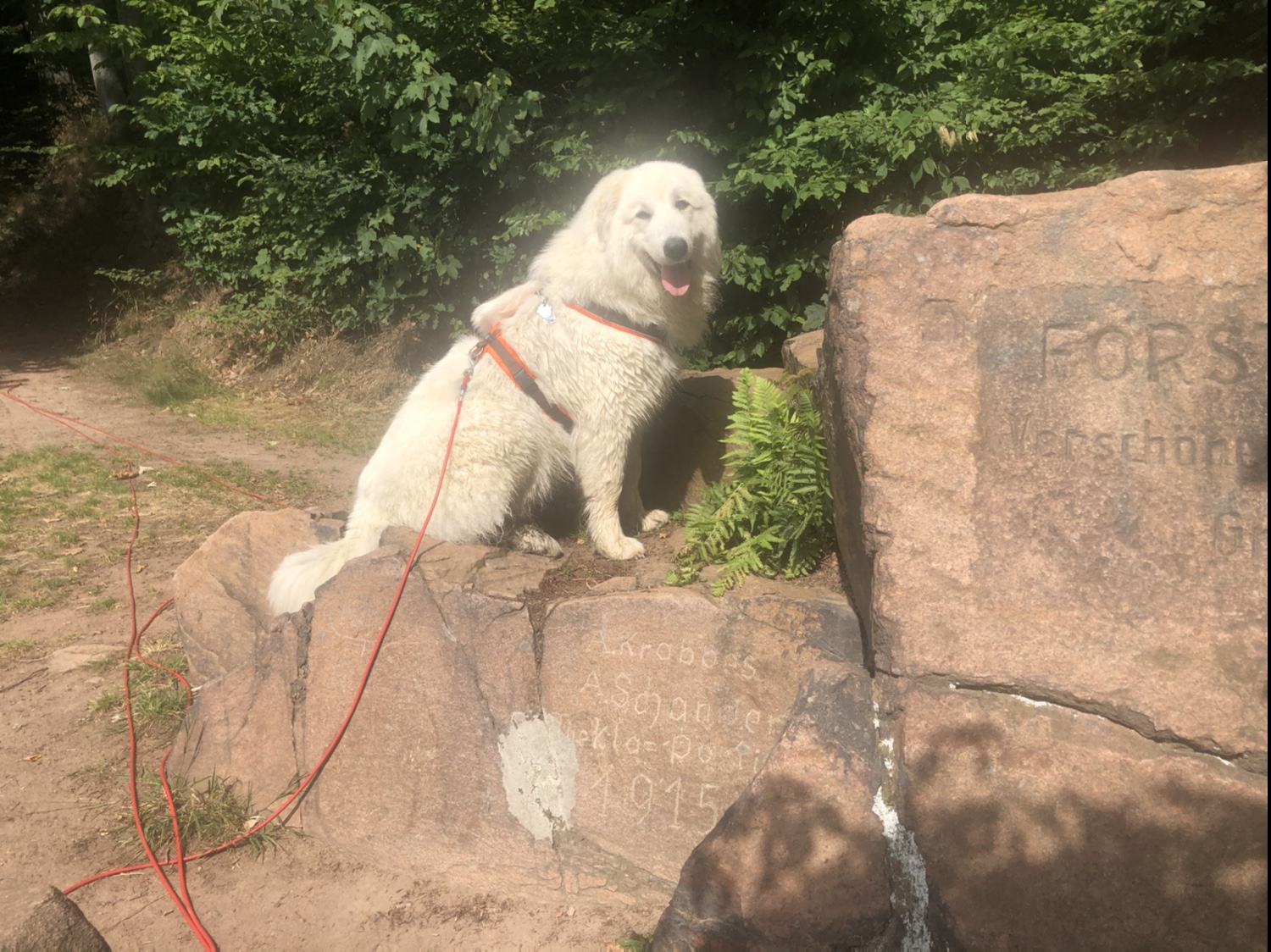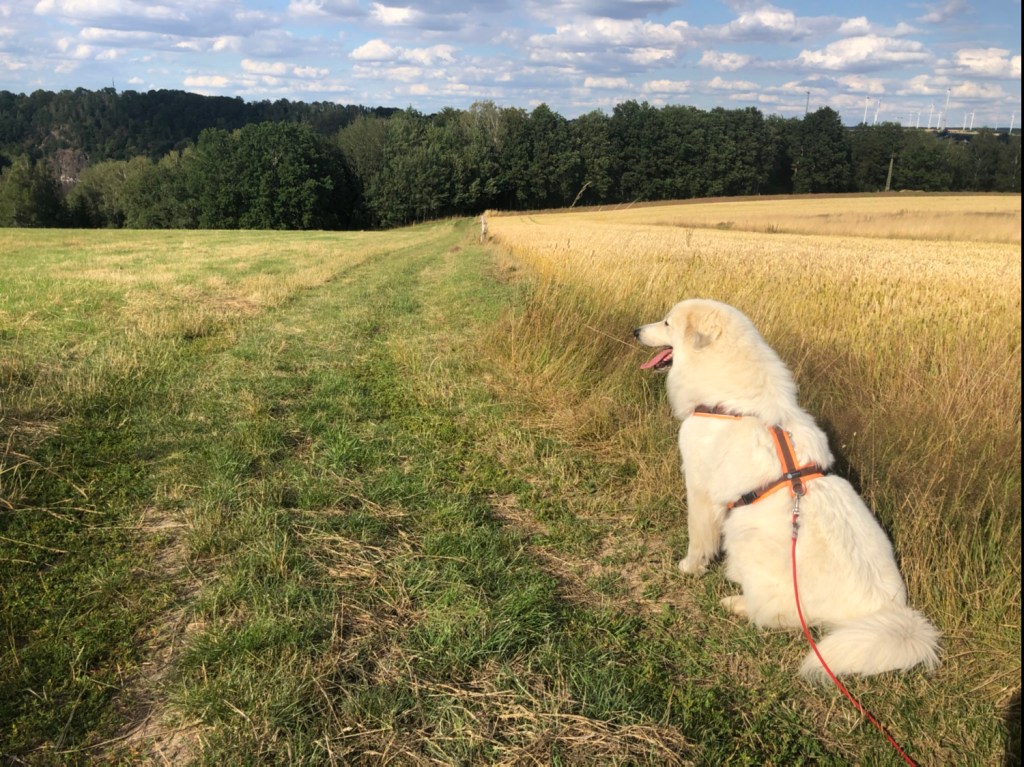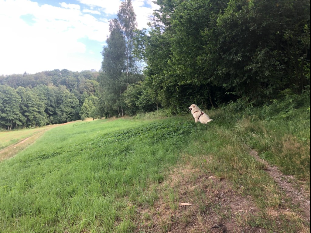 Wir sind dann um das Feld herum und über die Wiese in den Wald gegangen. Und dann durch den ganzen Wald zur Fuchsfarm. Ich habe unterwegs ganz viel und ganz lange geschnuffelt. Wir haben uns ganz viel Zeit gelassen. An der Fuchsfarm wolkte mein großer Mensch dann einen anderen Weg gehen. Aber ich wollte so laufen, wie wir immer laufen. Da habe ich gewartet, bis mein großer Mensch zurückgekommen ist. Ich habe ein kleines stures Pyriköpfchen. Ein ganz hübsches. Und ich kann gucken.