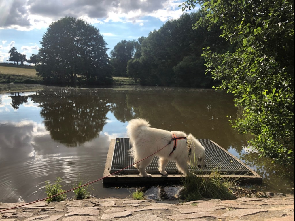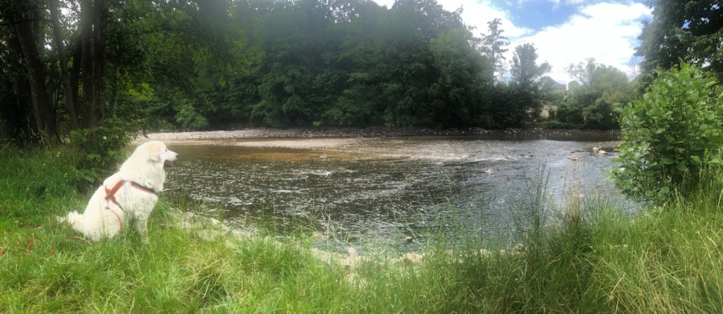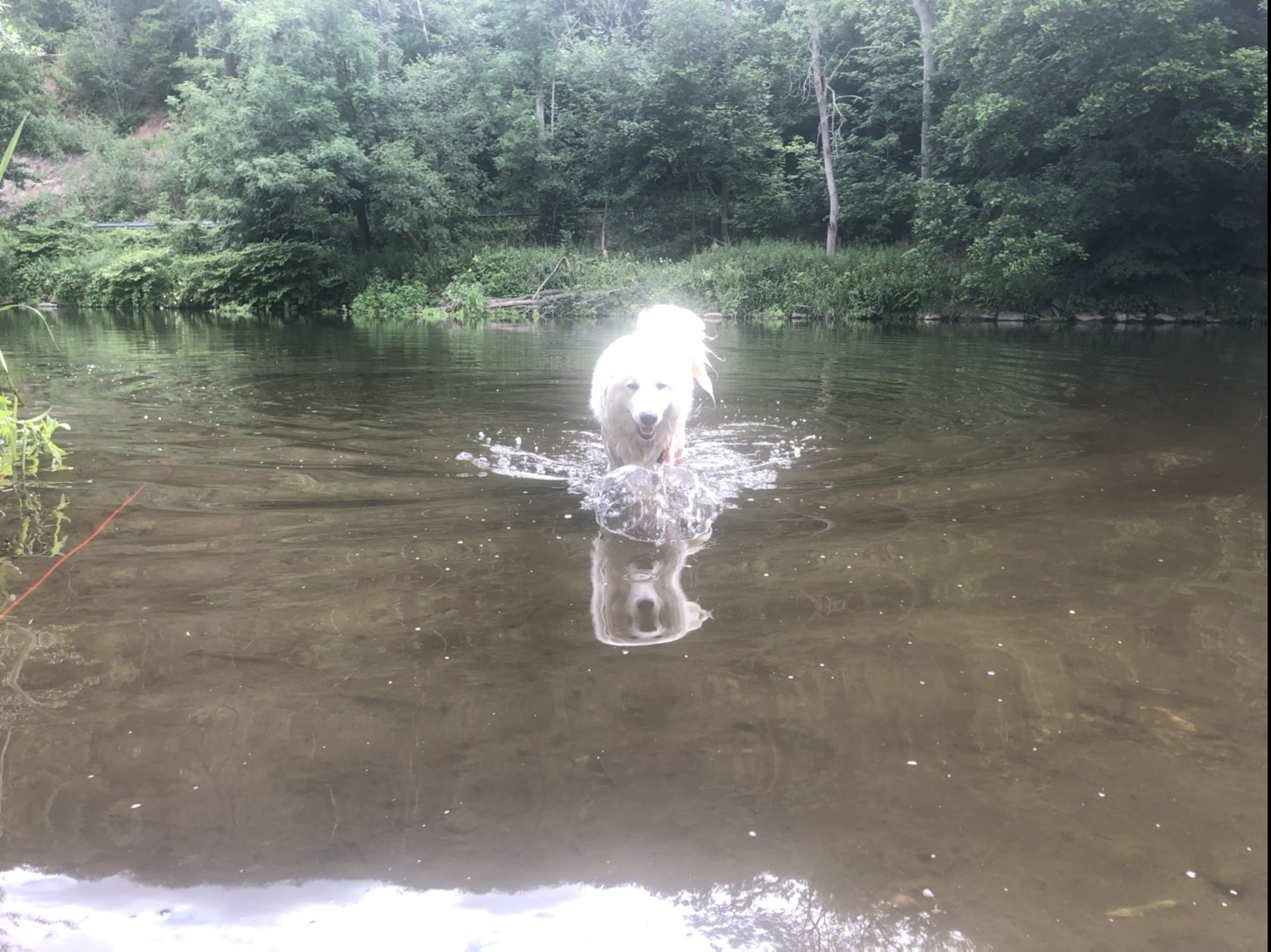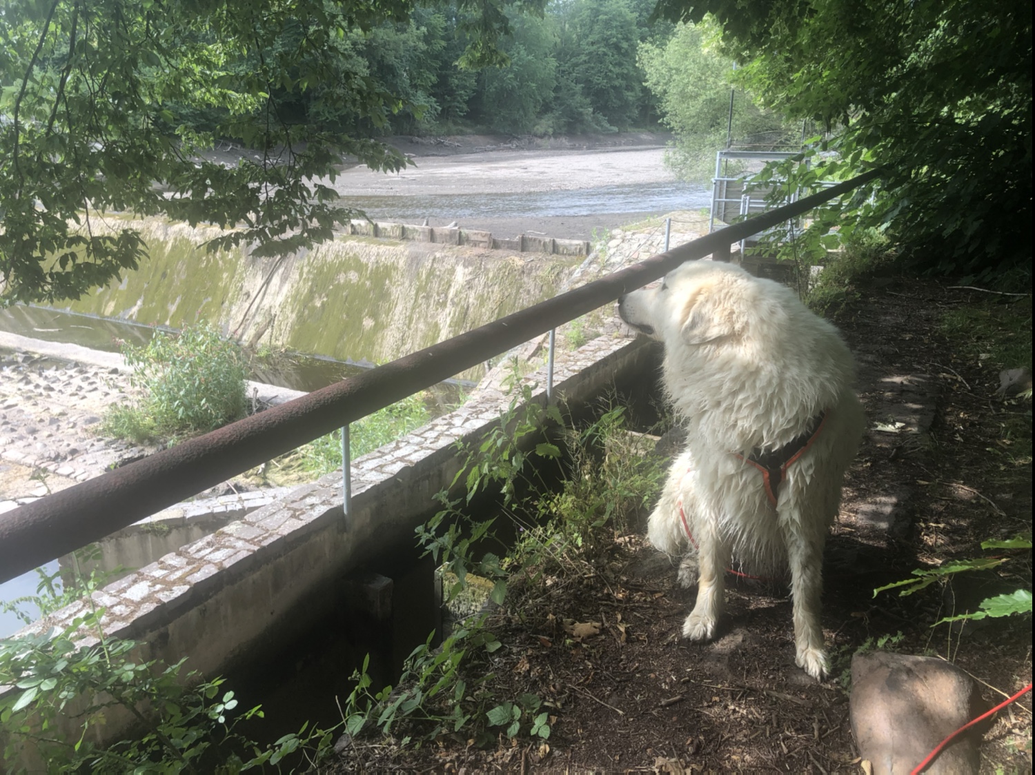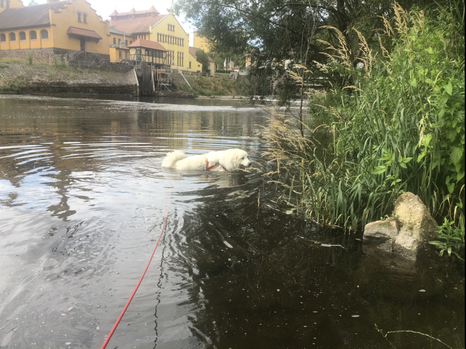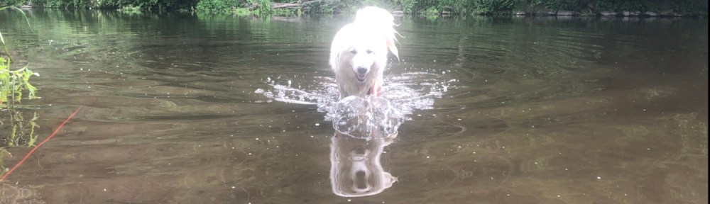 Die Bella kann ja jetzt schwimmen. Ich kann ganz weit in den Fluß reingehen und wenn es ganz tief wird, dann schwimme ich ein Stück. Bis zum Rücken geht mir da das Wasser. Aber tauchen will die Bella nicht. Ich bin doch kein Fisch. Ich bin eine Pyrenäenberghündin! Mit ganz dickem Pyrifell. Jawoll!