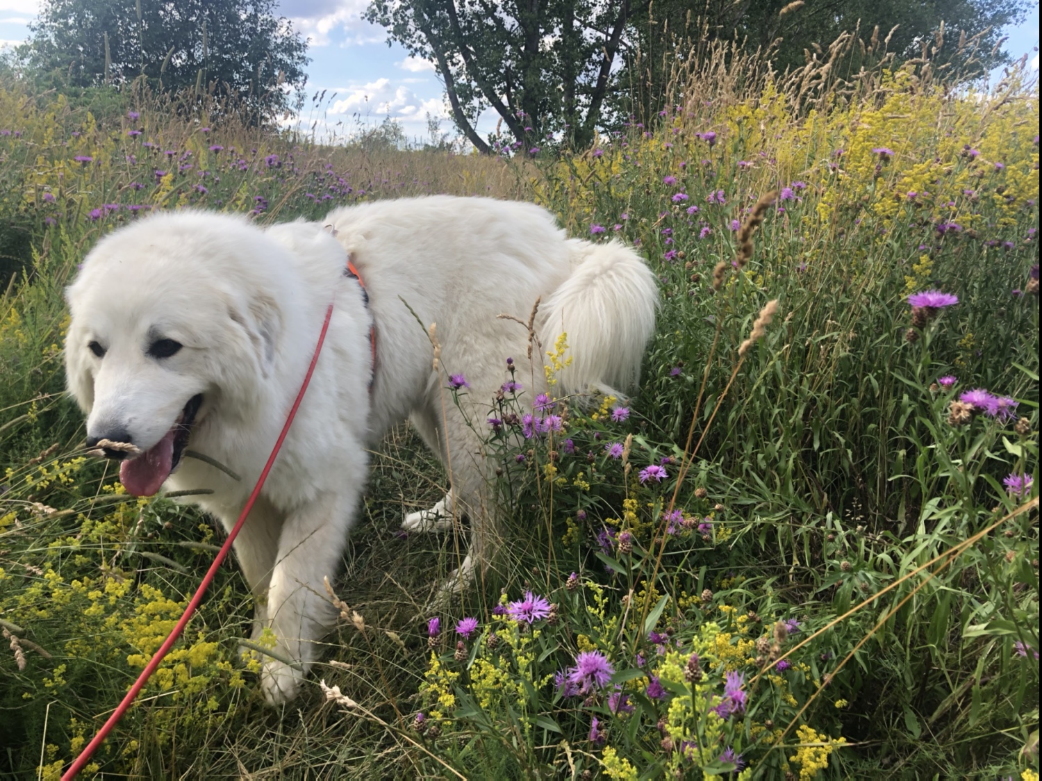 Dann sind wir über die große Wiese und zur kleinen Wiese. Die blüht doch jetzt so schön. Ooooo, das sieht so schön aus. Ganz bunt. Wilde Wiesenblumen und -gräser. Das gefällt der Bella. Und meine liebe Sonne hat alle schön beleuchtet.