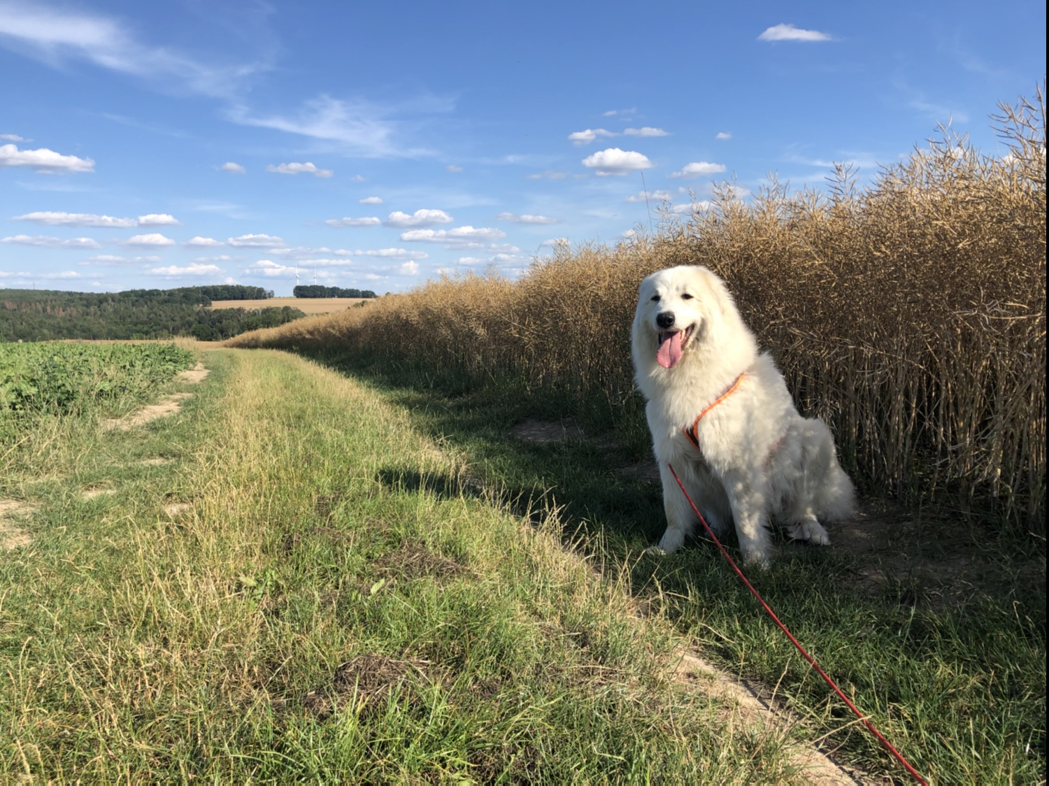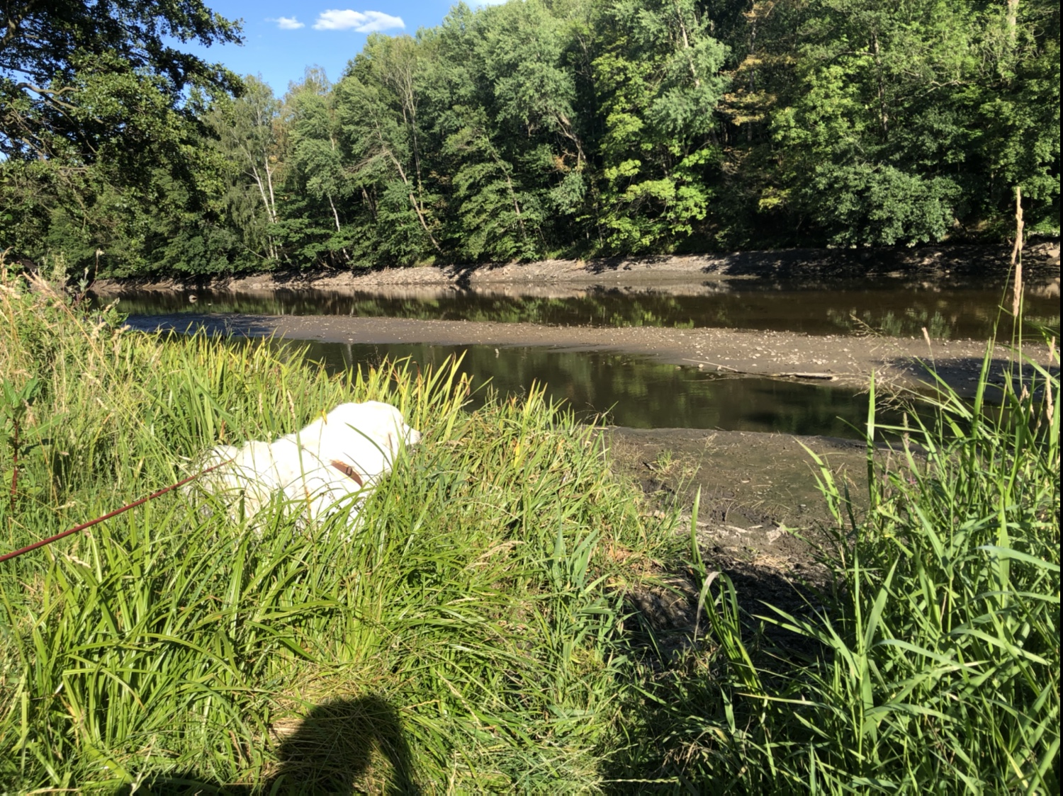 Dann habe ich nach dem Abendfuttern mit meinem großen Mensch noch meinen Abendspaziergang gemacht. Wir sind zum großen Feldweg gewandert und dann über den kleinen Feldweg zur große Wiese und den Hang runter zur Wiese am großen Fluß mit dem komischen Namen. Da waren zwei Hunde in dem, was vom Wasser noch übrig ist. Die Bella ist dann auch noch die Böschung runtergekletter und hat was getrunken und ihre Pfötchen gekühlt.