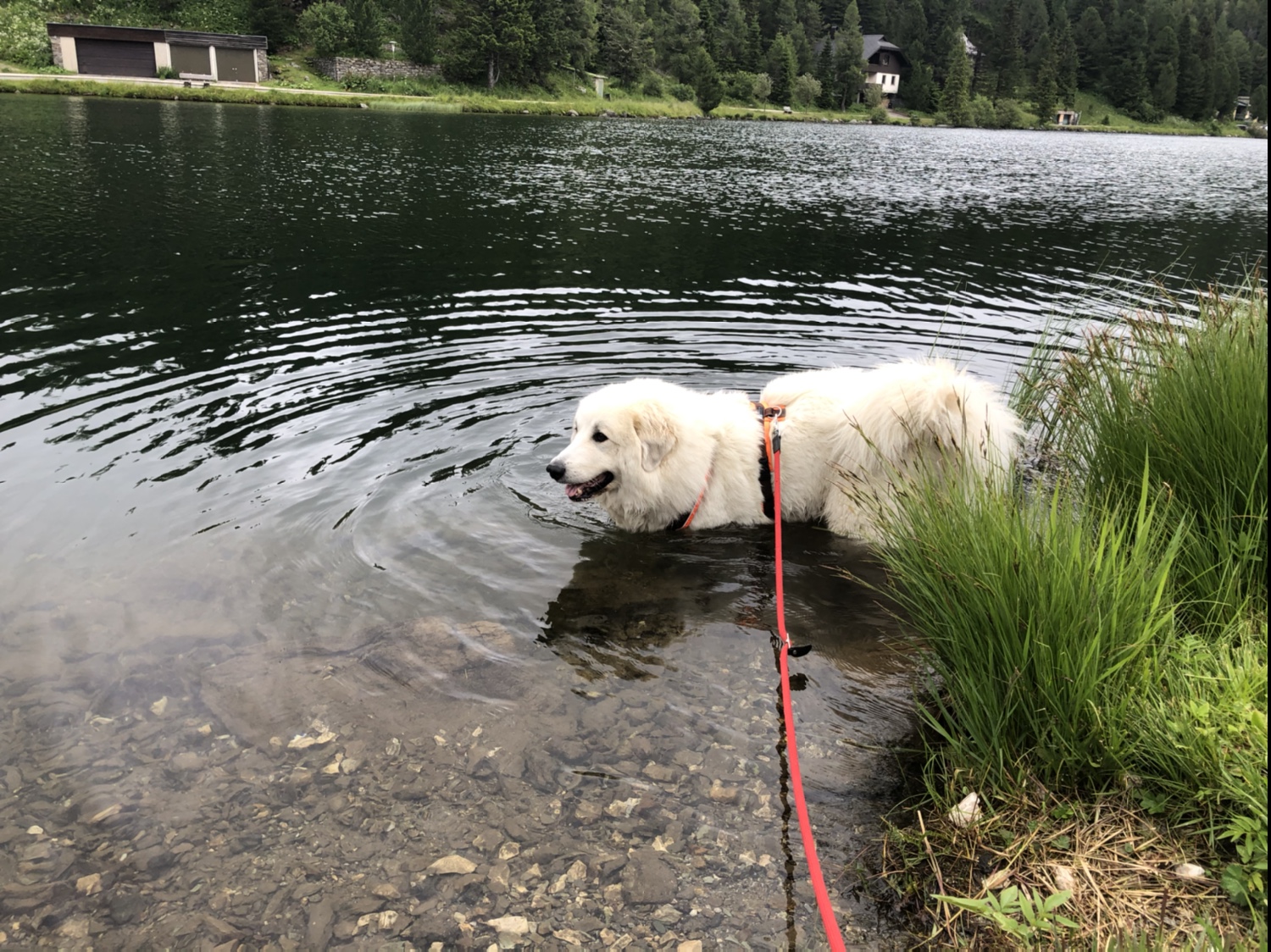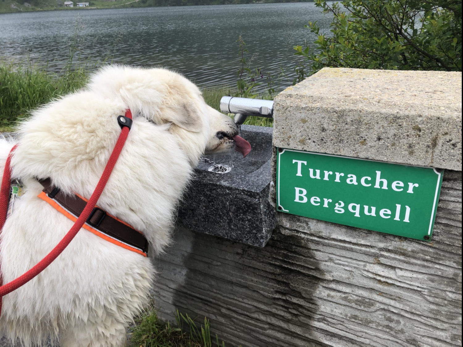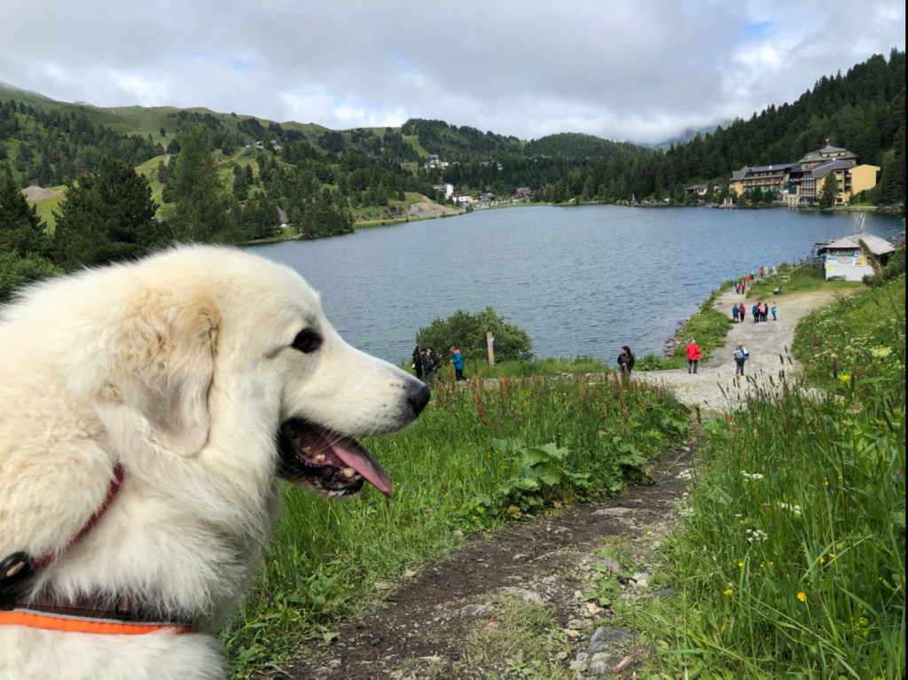 Unterwegs haben wir ganzganz viele Menschen getroffen. Auch mit Fahrrädern. Und ich habe niemanden angeschimpft. Und Hunde haben wir auch getroffen. Da war ich auch lieb. Das hat meine Menschen gefreut. Und dann sind wir plötzlich in Kärnten gewesen. Das ist ein anderes Land. Aber immer noch am Teich, der Turracher See heißt.