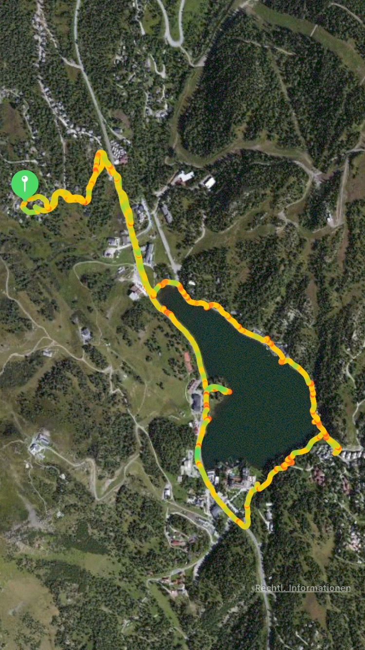 Der Himmel ist wolkenverhangen und es beginnt auch zu regnen. Wir entschließen uns zuerst am straßenseitigen Seeufer entlang zu laufen. Bella geht gleich erstmal im See baden und etwas trinken. Hinter dem Hotel „Hochschober“ geht es weiter und am bergseitigen Seeufer, am Hotel „Jägerwirt“ vorbei. Wieder zurück. Inzwischen hat es auch aufgehört zu regnen.