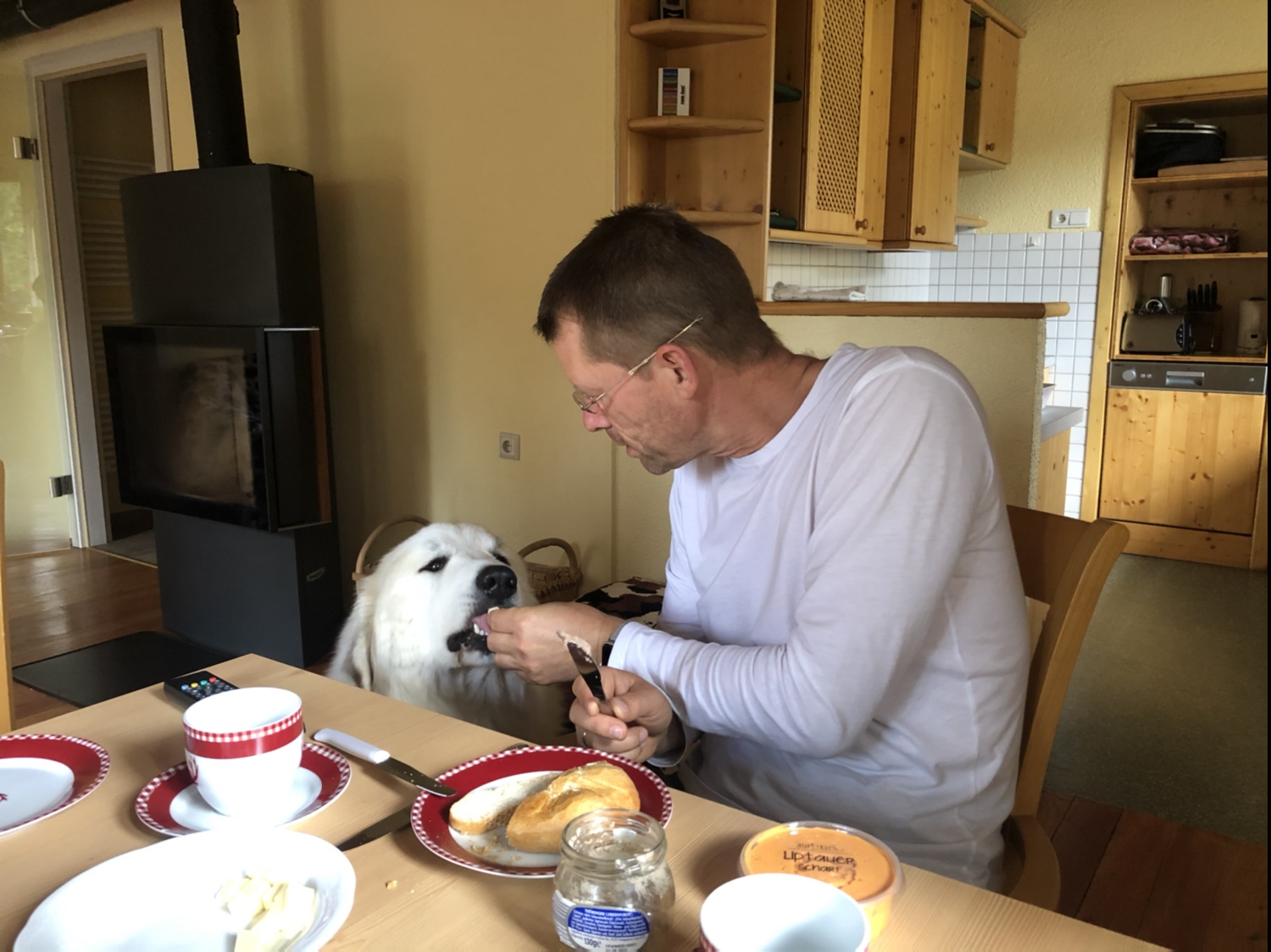 Zum Frühstück gibt es die hausgemacht Marmelade vom Gasthof „Alpenrose“: Erdbeere, Heidelbeere und Ribisel. Die Frühstücksbrötchen hängen, noch warm dampfend, pünktlich 6.30 Uhr an der Haustür. Die Marmelade ist so lecker, daß wir nach dem Frühstück gleich noch ein Glas Heidelbeere und ein Glas Kirsche holen.