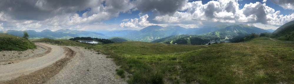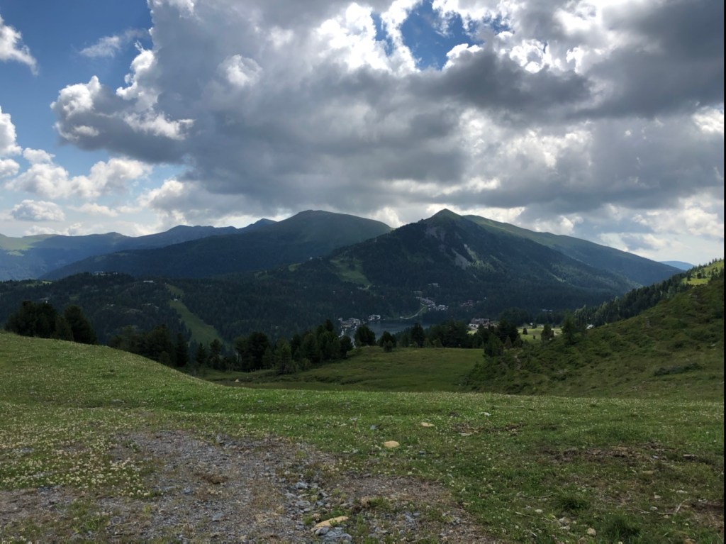 Direkt nach dem Frühstück geht es bei Sonnenschein und vereinzelten Wolken dann los. Wir gehen zunächst durch die Maierbruggersiedlung und dann weiter den Forstweg entlang in Richtung Schafalm. Bevor wir die erreichen biegen wir auf den Skihang ab um auf den Wanderweg zur Bergstation der Kornock Panoramabahn zu gelangen.