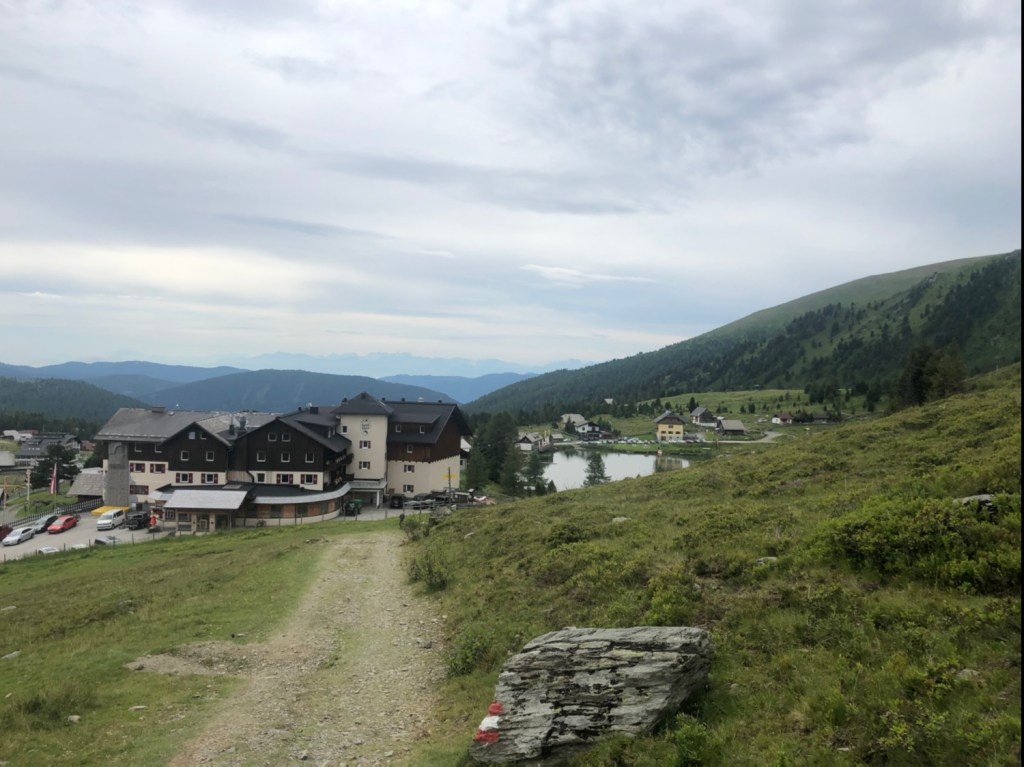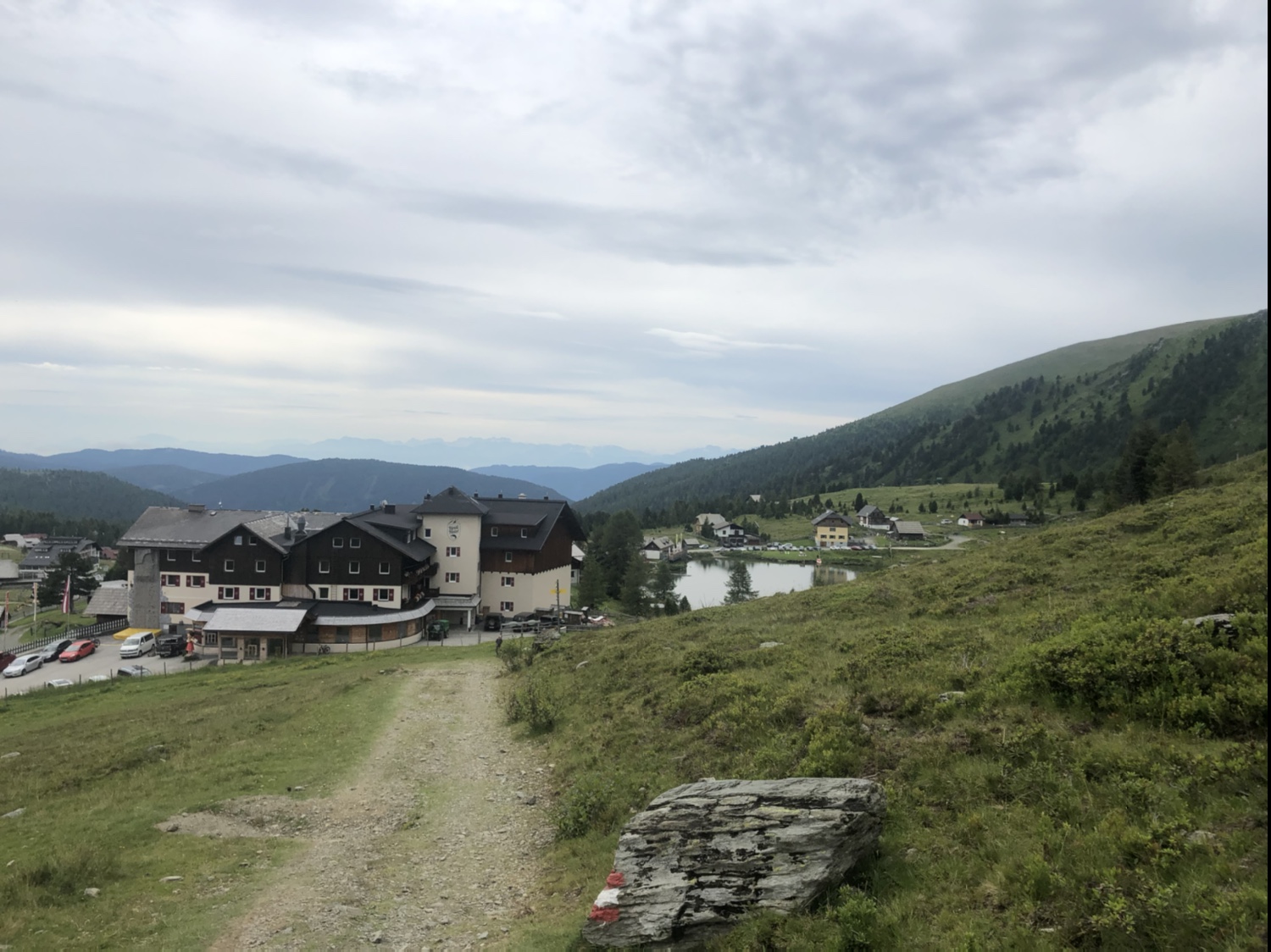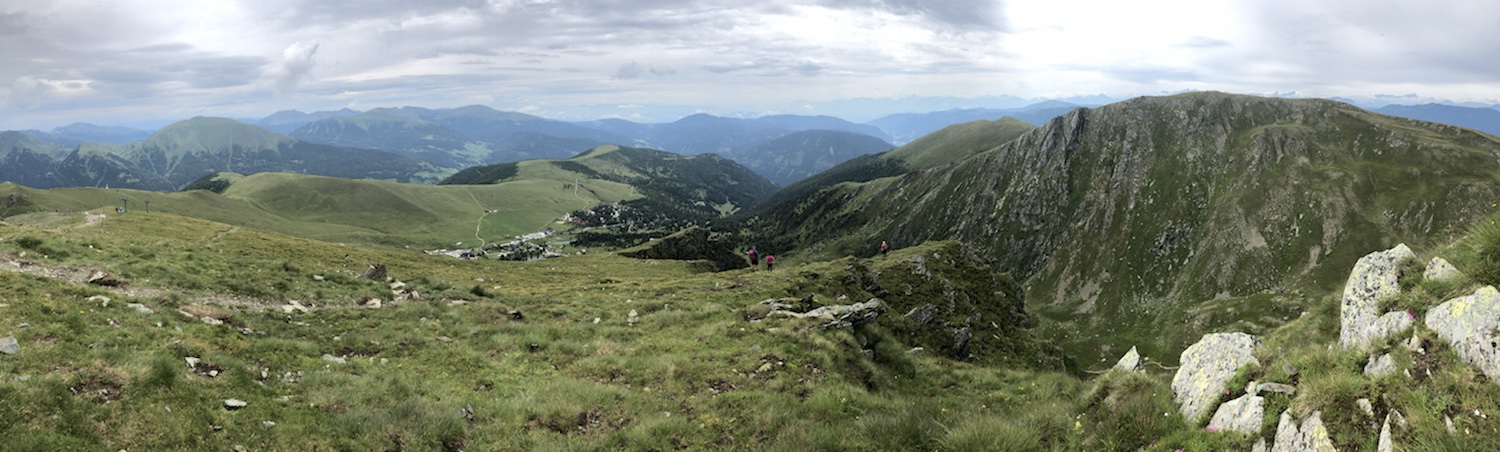 Wir machen uns auf den Weg zum Falkert (2.308 m.ü.A.). Alex und Jessi gehen lieber an den Falkertsee (1.870 m.ü.A.). Der Wanderweg ist mit einer Gehzeit von 1 Stunde und 15 Minuten ausgewiesen. Zum Glück ist der Himmel bewölkt, wir haben keine pralle Sonne. Gemütlich wandern wir den steilen Anstieg zum Gipfel hinauf. Unterwegs genießen wir immer wieder die herrliche Aussicht.