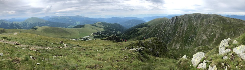Auch auf dem Gipfel ist ganz schön Betrieb. Kein Wunder bei dem Wetter und der schönen Aussicht. Wir haben eine gute Sicht in die Nockberge, sehen die Nockalmstraße mit der Paßhöhe Eisentalhöhe (2.049 m.ü.A.). Auch Richtung Turracherhöhe ist die Sicht gut.
