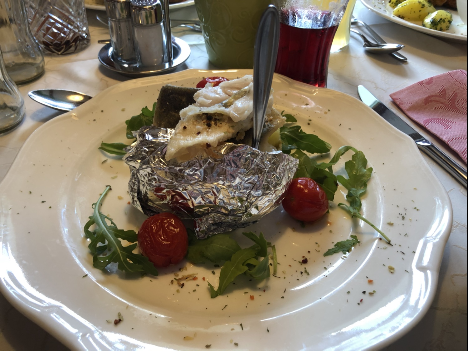 Bella verschwindet zielstrebig unter dem Tisch. Das macht sie jetzt immer sofort. Auch sonst ist sie ganz lieb, selbst als plötzlich zwei andere Hunde direkt an unserem Tisch vorbeischlendern. Auch an anderen Tischen sind Gäste mit Hunden, die Pyri ist heute total entspannt.