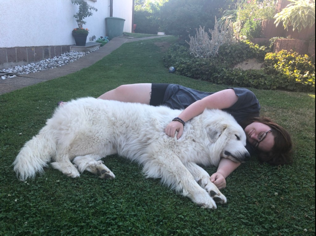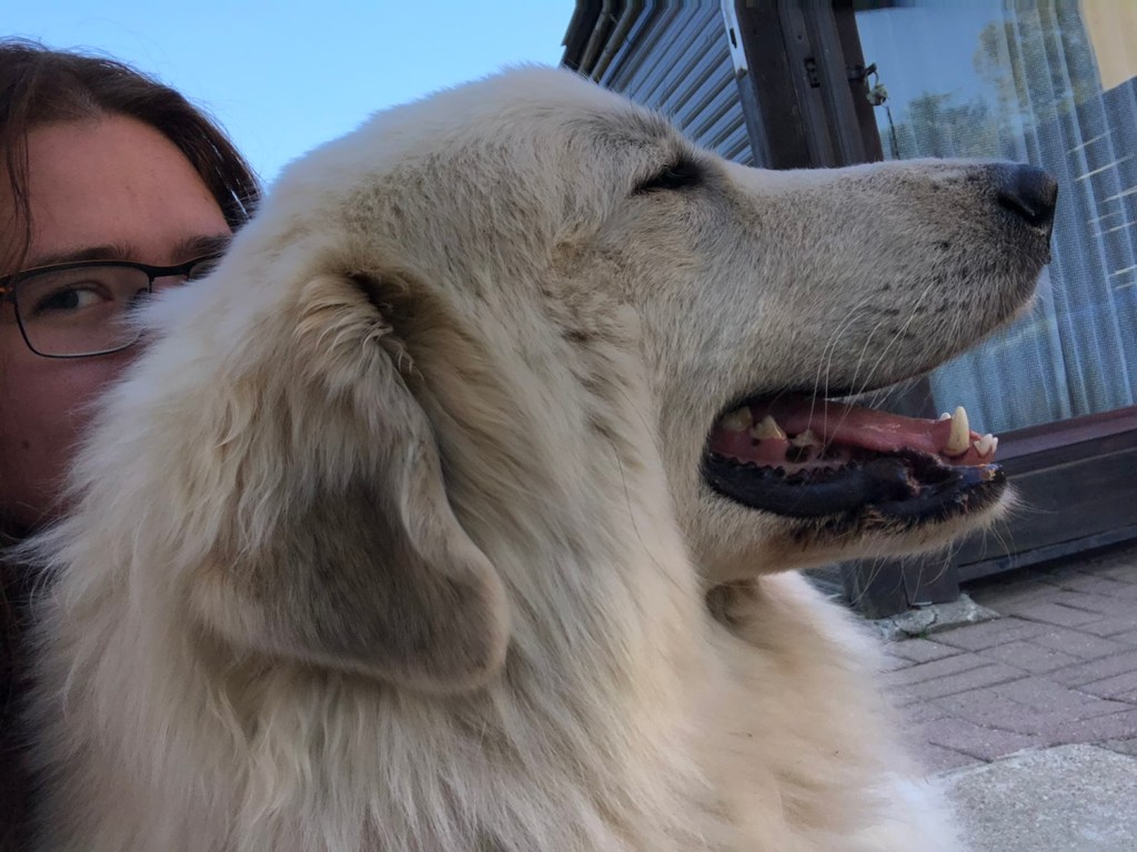 Ich habe mich den ganzen Tag ausgeruht. Im Schatten! Weiiil, es war doch so warm. Meine Menschenschwestern sind auch mal bei mir gewesen. Meine kleine Menschenschwester hat sich im Pool die Menschenfüßchen gekühlt und meine große Menschenschwester hat mit mir gekuschelt.