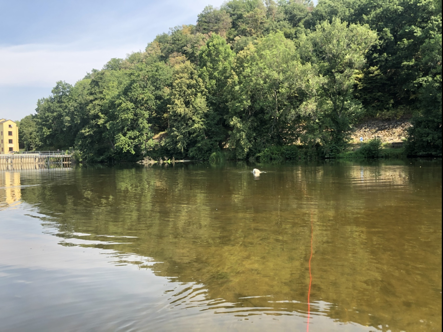 Heute ist Sonntag. Da macht man einen Sonntagsspaziergang. Aber es ist heute auch ganzsehr ganzschön heiß. Das ist ganz anstrengend. Mein großer Mensch hat mich trotzdem angezogen. Und dann sind wir mit meinem weißen französianischen Auto gefahren. Nur ganz kurz. Bis zum großen Fluß mit dem komischen Namen.